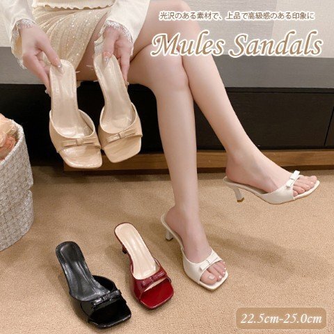 ・光沢のある素材で、上品で高級感のある印象になるレディースサンダル。