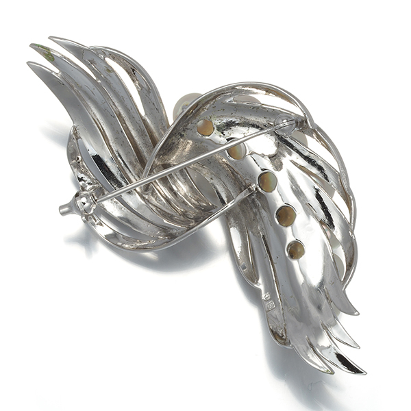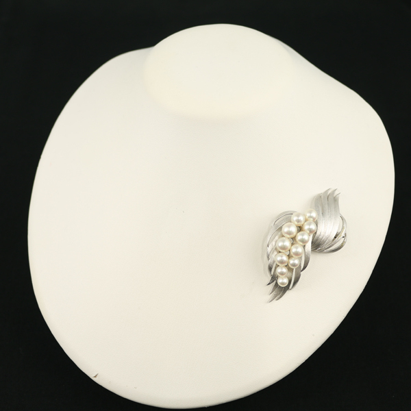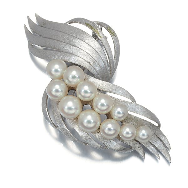 艶を抑えたフロスト加工の優雅な煌めきと共に溢れんばかりの輝きを披露するアコヤ真珠を贅沢に飾ったタサキのブローチジュエリーです。 |