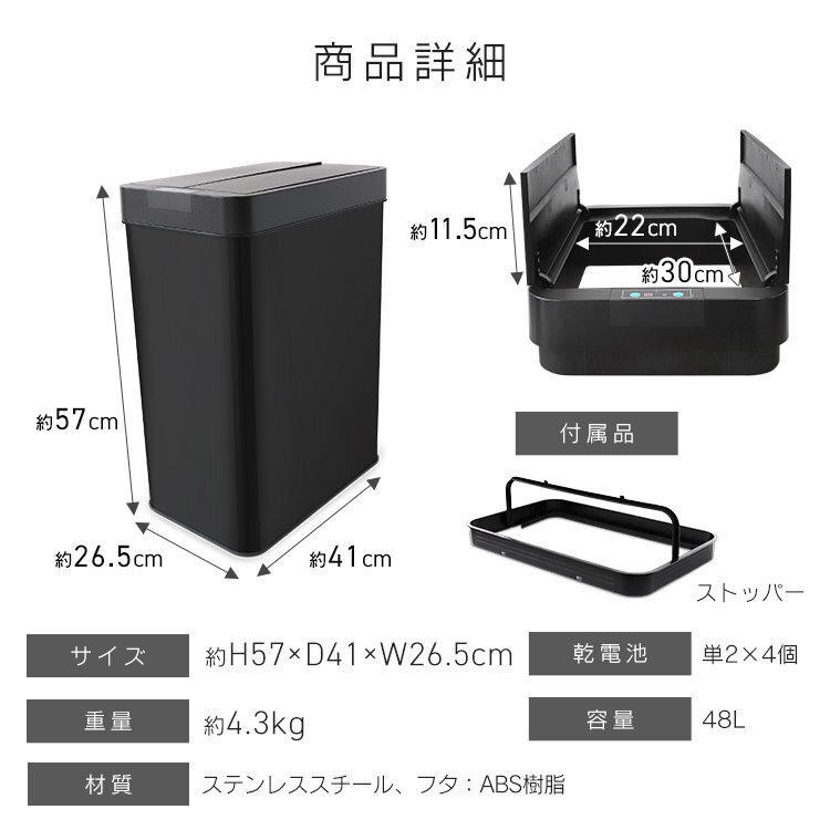 | とっても便利!センサーでフタが自動開閉! 手をかざすとセンサーが感知してフタが開きます。 直接手を触れずに開けられるので、とっても衛生的です! 台所はもちろんのこと、赤ちゃんのおむつ捨て、医療の現場にもぴったりです! 手動で開閉OK! 操作パネルには、センサーの他に手動で開けたり閉じたりできるするボタンが付いています。 大容量な48Lタイプでシンプルなデザイン。 キッチンやリビングなどに置いてもマッチしやすいです。 ■商品コード:FHB005OB ■商品仕様 カラー:ブラック 容量:48L サイズ:(約)幅26.5cm×奥行き41cm×高さ57cm 重量:(約)4.3kg 使用電池:単二電池×4(別売) 素材:ステンレススチール、ABS樹脂 他 ■注意事項 ・本商品には電池は付属しておりません。 ・商品は、モニターによって色合いが異なって見える場合があります。 ・仕様・デザインは改良のため予告なく変更することがあります。 ■保障期間 7日間 ※商品到着後7日以内の初期不良・破損のみご対応させていただきます。 【新品未使用品です】 |
