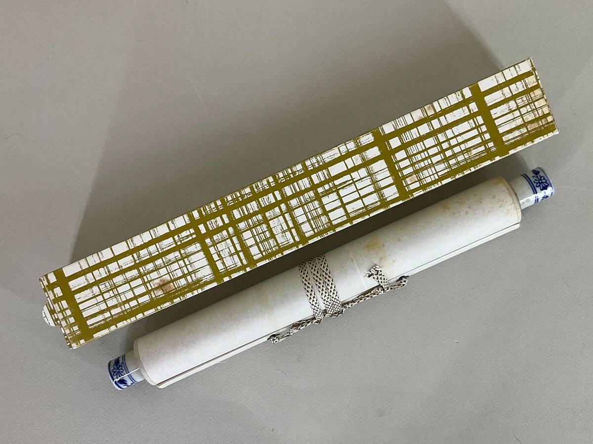 古い掛け軸は軸先を固定している接着剤が弱り、輸送途中の衝撃で軸先が外れてしまう場合がございます。