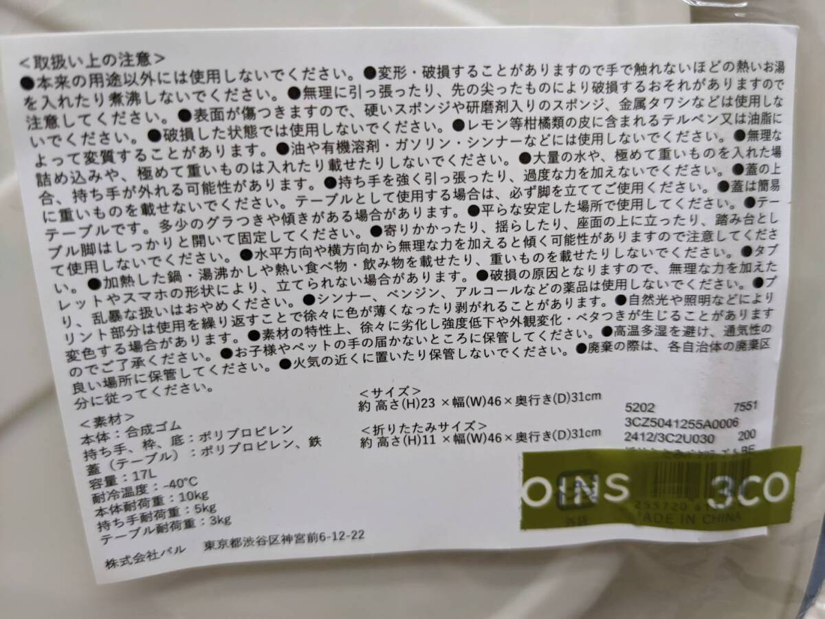 | 送料無料S97999 3coins 折りたたみバケツテーブル 持ち運び 高さ23cm 幅46cm 奥行き31cm 未開封 未使用 未使用、保管品になります。 保管品の為、経年劣化や画像では分かりにくい小傷、スレ等がある場合があります。 画像に写っている物が全てとなります。岐阜県関市 トラブル防止の為、神経質な方や完璧を求める方は御遠慮下さいますよう、御願い申し上げます。 | ||