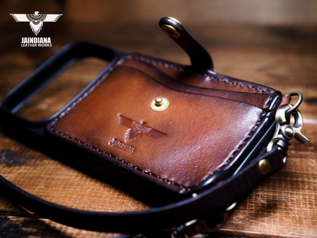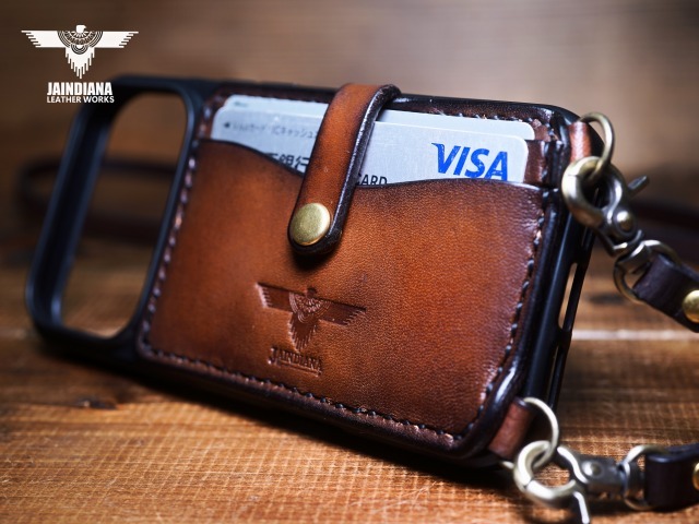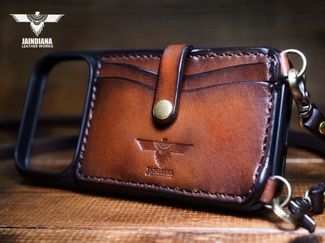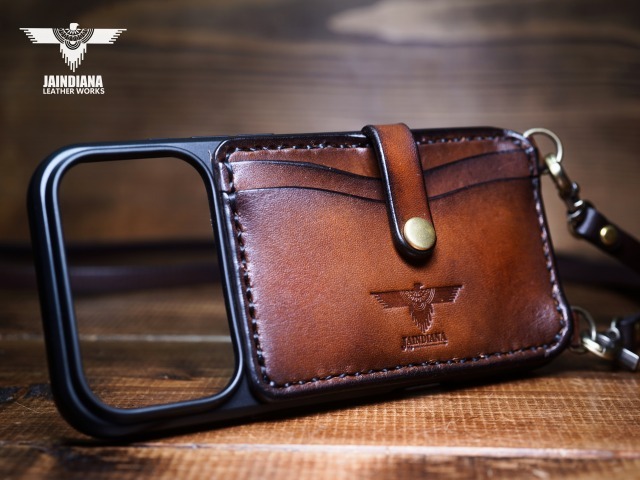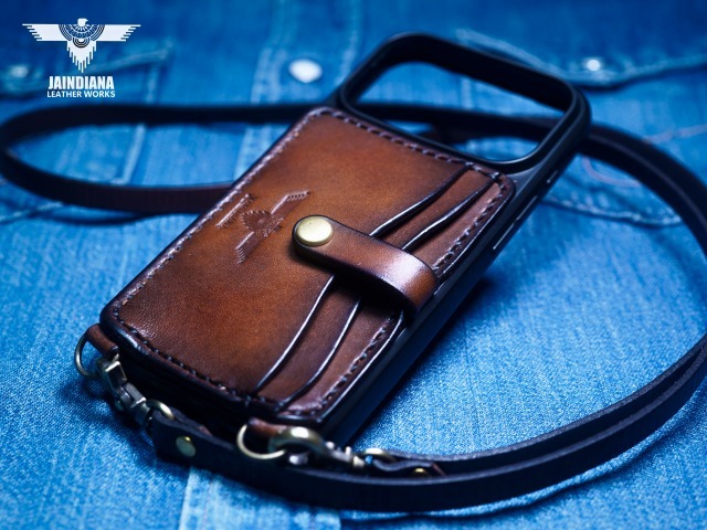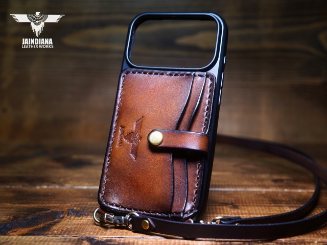 | iPhone17Proケース 手縫い サドルレザー ビンテージ染めライトブラウン ネックストラップ付き(iPhone17Air仕様での製作も可) | ||||