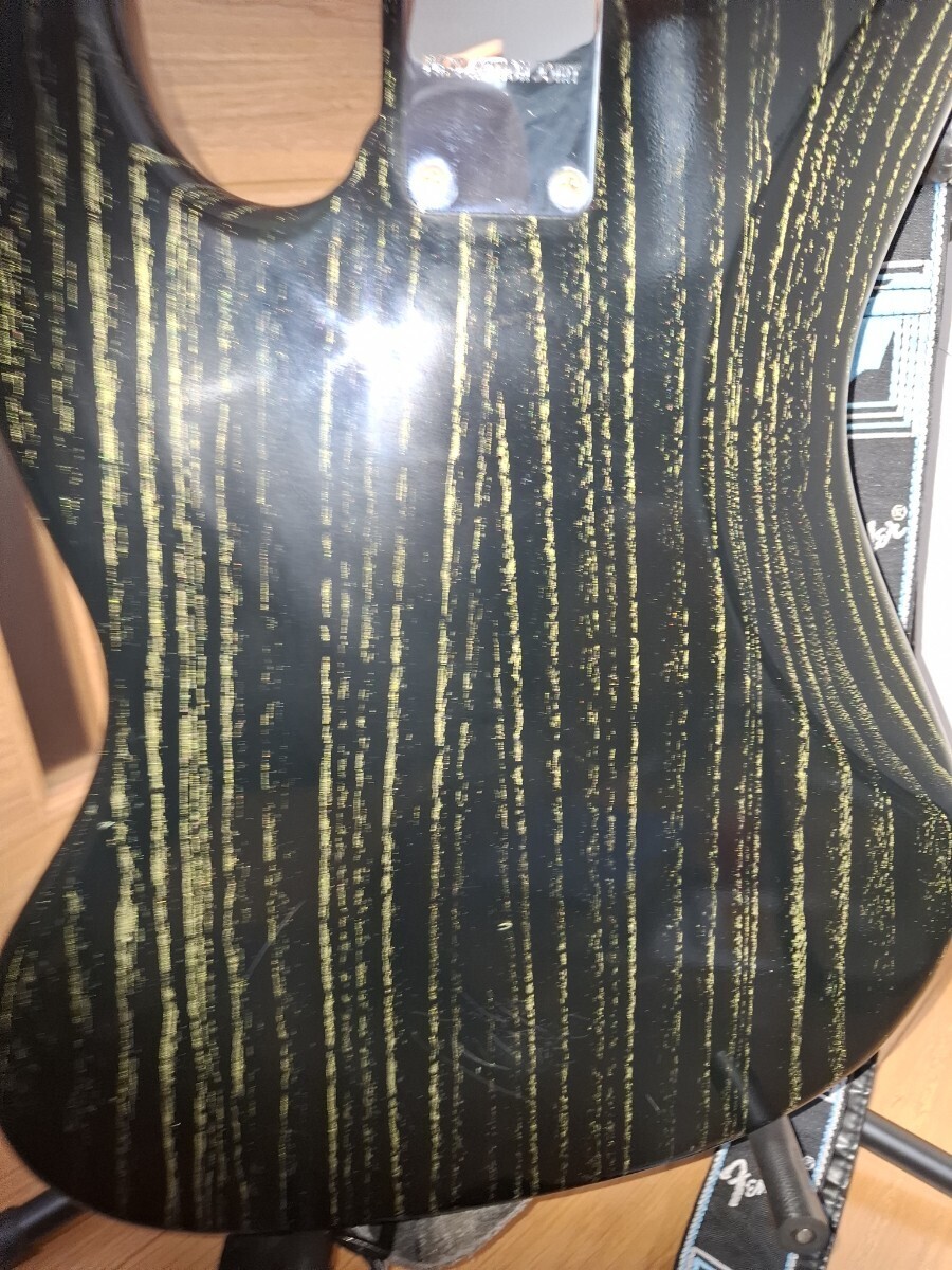 弦交換済み。付属品は、写真のフェンダーのものとは違いますがストラップ及びソフトケースです。ギター用段ボールに入れて発送致します。