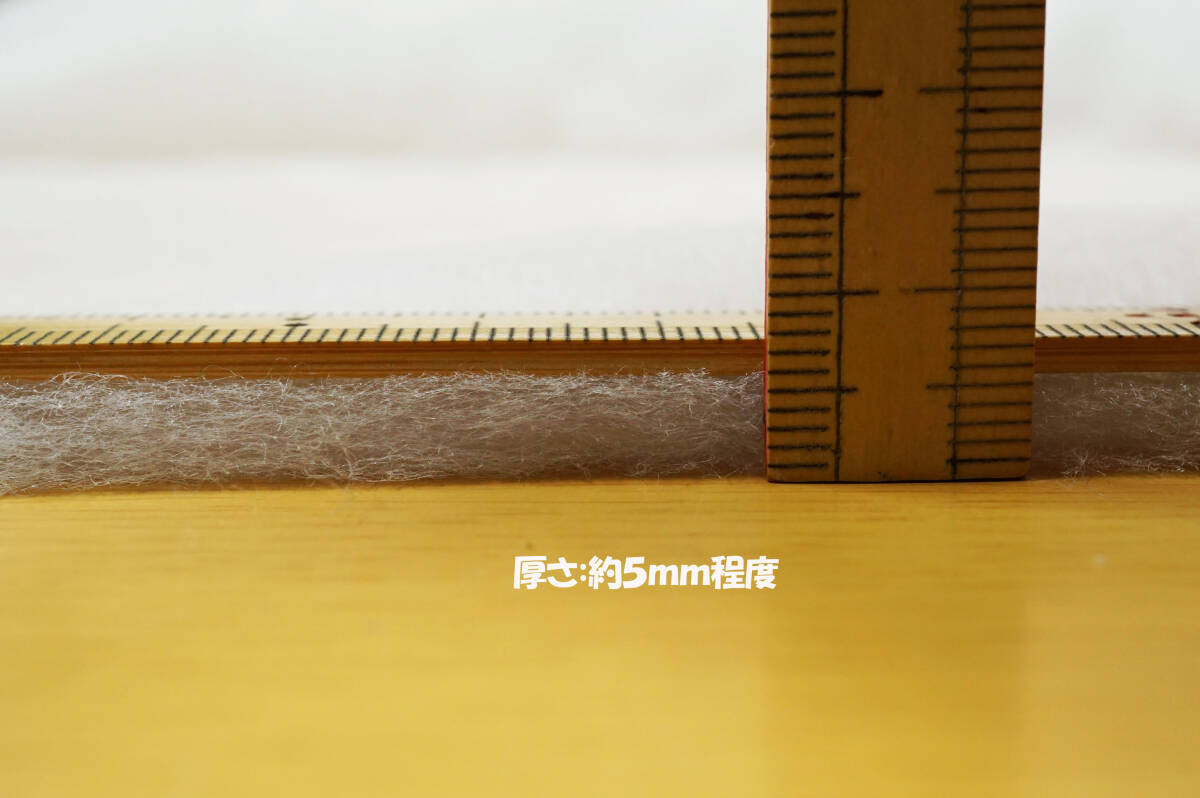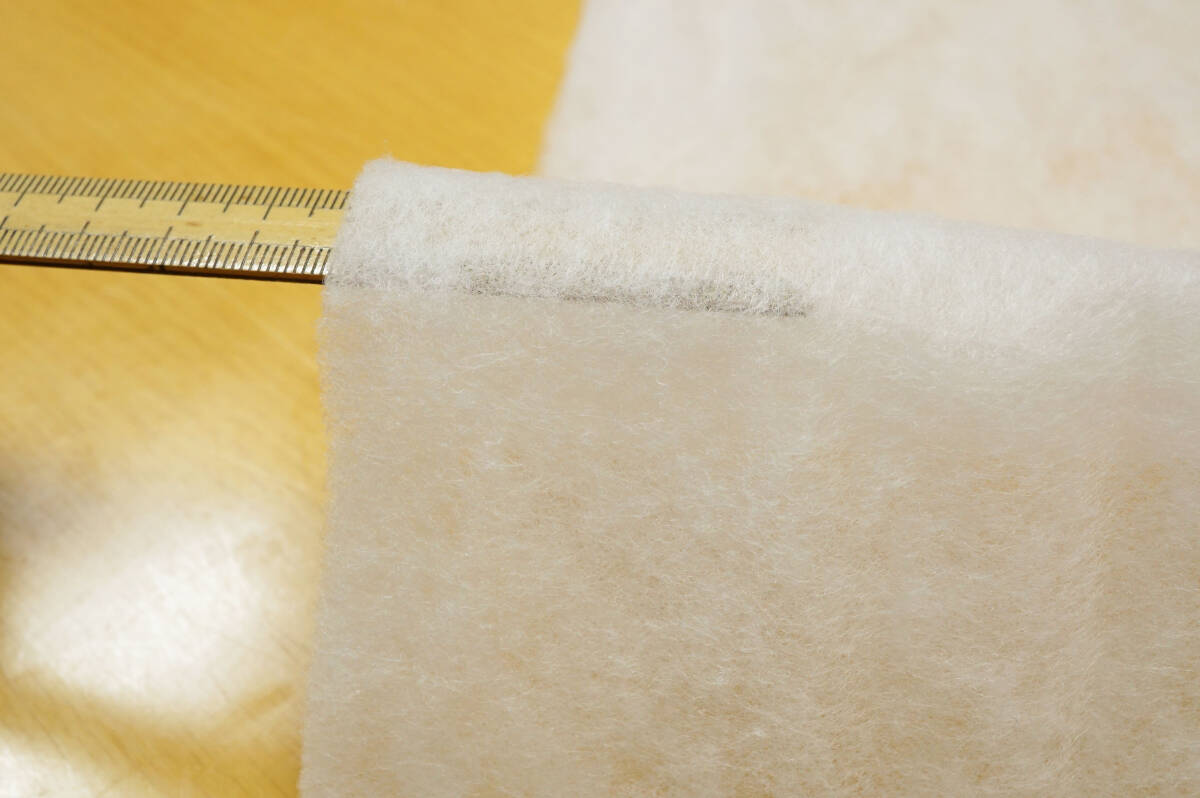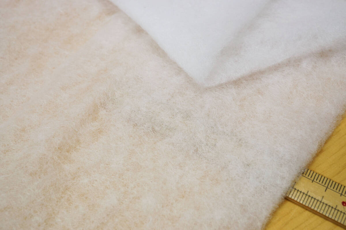 ポリエステル100%、微薄タイプ、ややソフト系、色調:白で、手元定規で厚さ約5mm前後でございますが、耳部分に少量の「汚れ」がございます。また、部分によっては厚みにバラツキがございます。ご理解の上ご入札お願い申し上げます。
