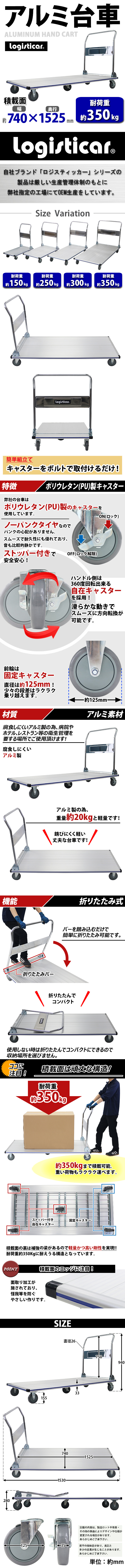 | 商品名 | 送料無料 台車 アルミ台車 折りたたみ 耐荷重約350kg 積載面約740×1525mm 平台車 大型台車 重量台車 台車 手押し台車 運搬台車 業務用 アルミニウム 軽量 頑丈 コンパクト 約74×152.5cm 食品 冷蔵倉庫 クリーンルーム daishaalumip350 |