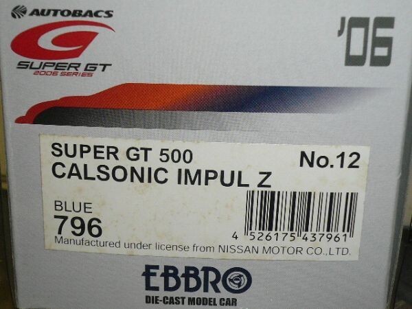 ☆1/43 EBBRO SUPER GT 500 CALSONIC IMPUL Z No.12 青です。箱に少し傷みがありますので,ご了承の上入札ください。商品の状況は写真でご判断の上、ノ-クレ-ム・ノ-リタ-ンでお願いします。保証はできませんが、定形外郵便での発送も可能です。