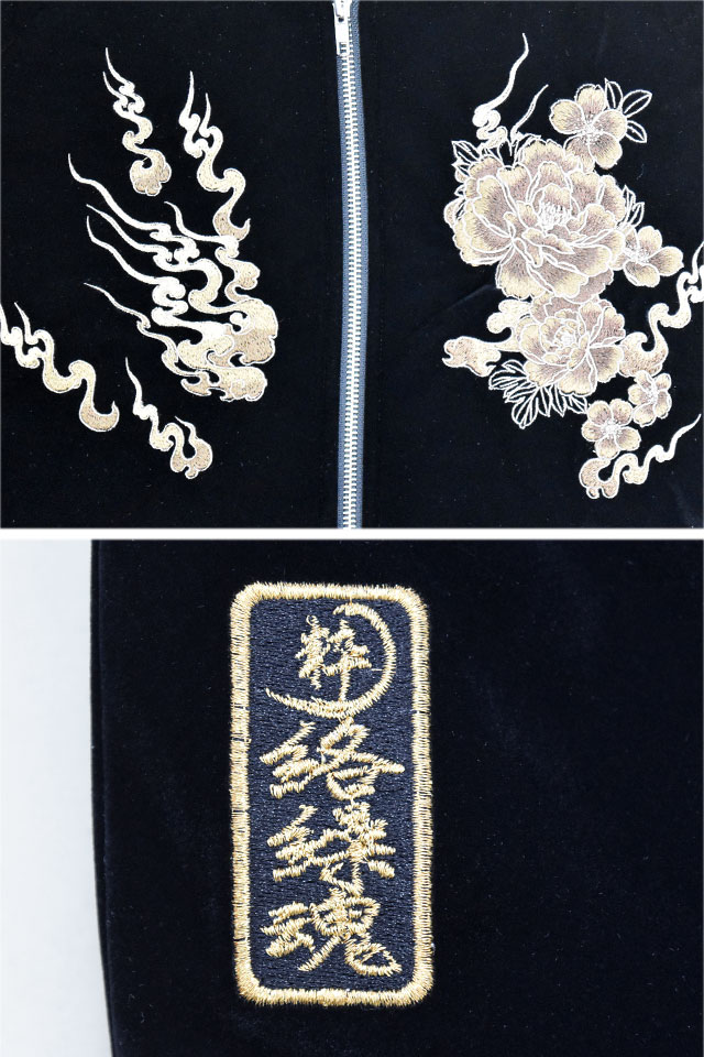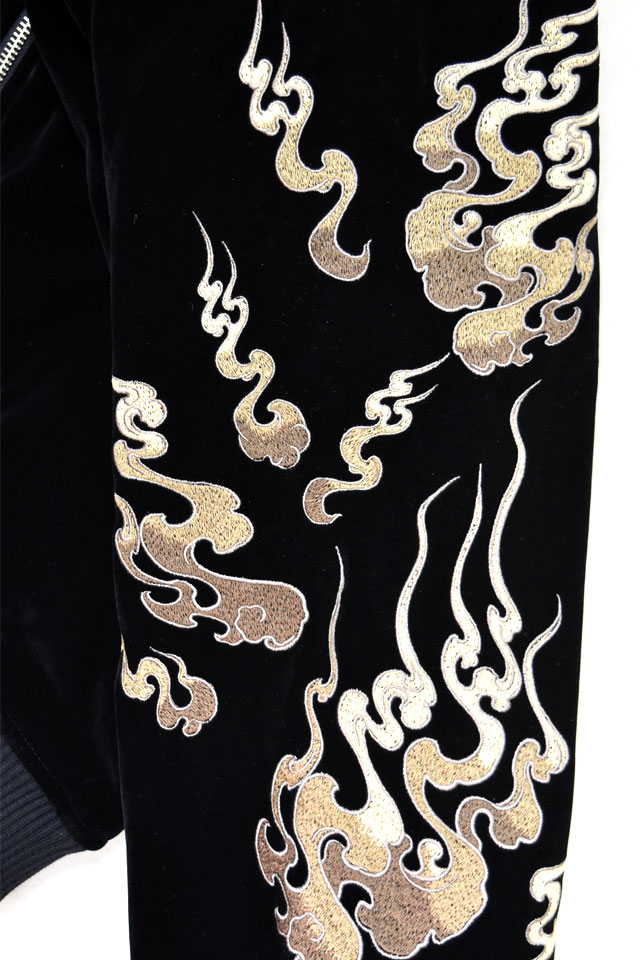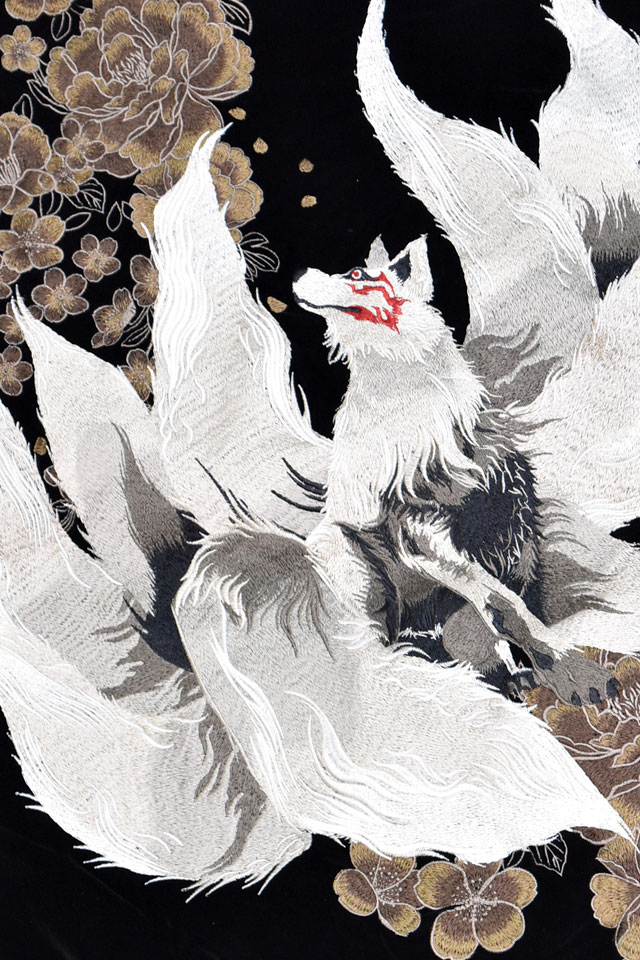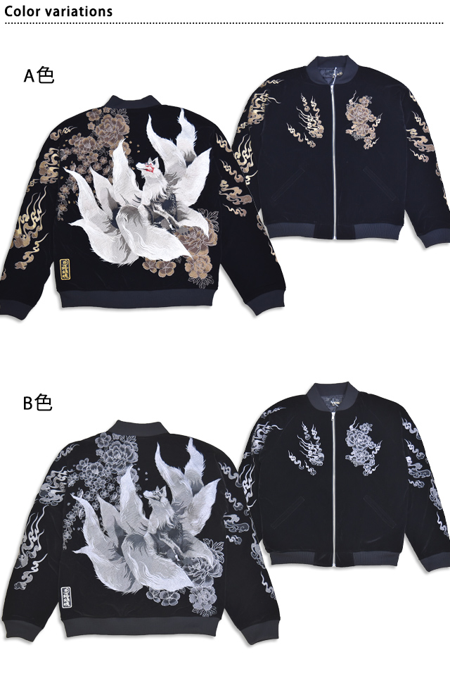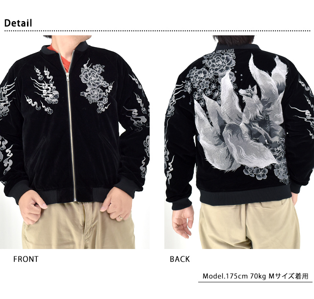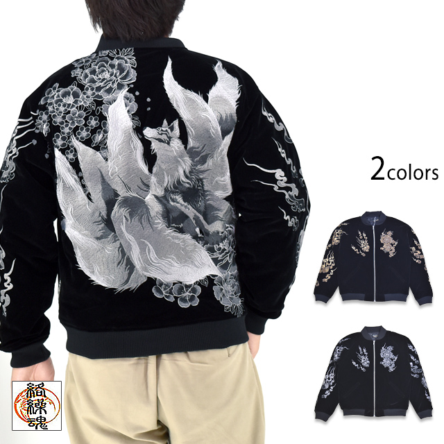 絡繰魂さんから「粋 火炎九尾の狐 別珍スカジャン(253067)」のご紹介です。 重みすら感じるほどの刺繍量が魅力的な絡繰魂の粋シリーズから、秋冬にぴったりのスカジャンが登場しました。 別珍素材のスカジャンは、なかなか手に入れることの出来ない人気アイテム。 今回は贅沢な総刺繍デザインとなっております。 背中には九尾の佇まいをダイナミックに刺繍。 フロント、袖には九尾が纏う炎を大胆に落とし込みました。 どちらのカラーもモノトーン調に仕上げられており、着こなしに取り入れやすいデザインとなっております。 フロントはジップアップ仕様。 | ||||||||||||||||||||