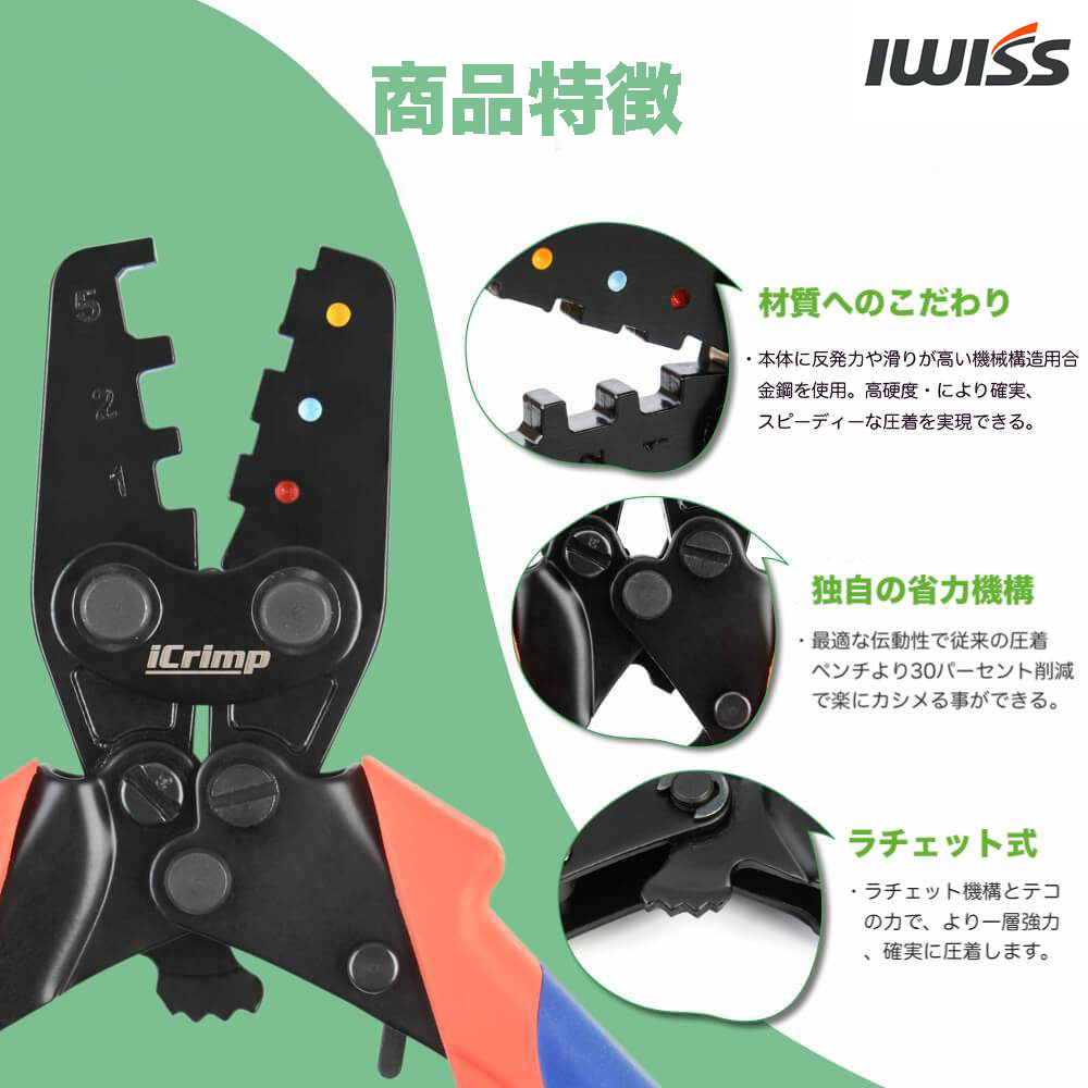アイウィス社絶縁被覆付閉端接続子と熱収縮タイプの絶縁端子両方使用可能な圧着工具です。 ※注:SB2218等ニチフ社防水圧着スリープに対応いたしませんので、ご注意ください。 ※JIS規格/UL・CSA登録品ではございません。UL・CSA準拠品としてEDMカット品HS-125をご検討ください。 圧着能力:0.5mm~6.0mm (AWG22~10) 全長:230mm 重量:600g 対応端子: ・絶縁閉端子および熱収縮タイプの絶縁端子の圧着に 圧着ダイス: ・(CE1) 0.5sq〜1.75sq ・(CE2)1.0sq~3.0sq ・(CE5(6)) 2.5sq-6.0sq IWISS アイウィス「IWISS」はプライヤやペンチを主力とした工具類が販売され、ドイツやアメリカをはじめ、世界50か国以上で販売されているの人気ブランドです。 発売されたオープンバレル用圧着ペンチやワイヤペンチがEUやアメリカのECサイトでベストセラーランキングで何度も1位になっている大ヒット商品です。高品質な材料から作られたそれらの製品はその精度と実績から高い信頼を得ています。 | |||