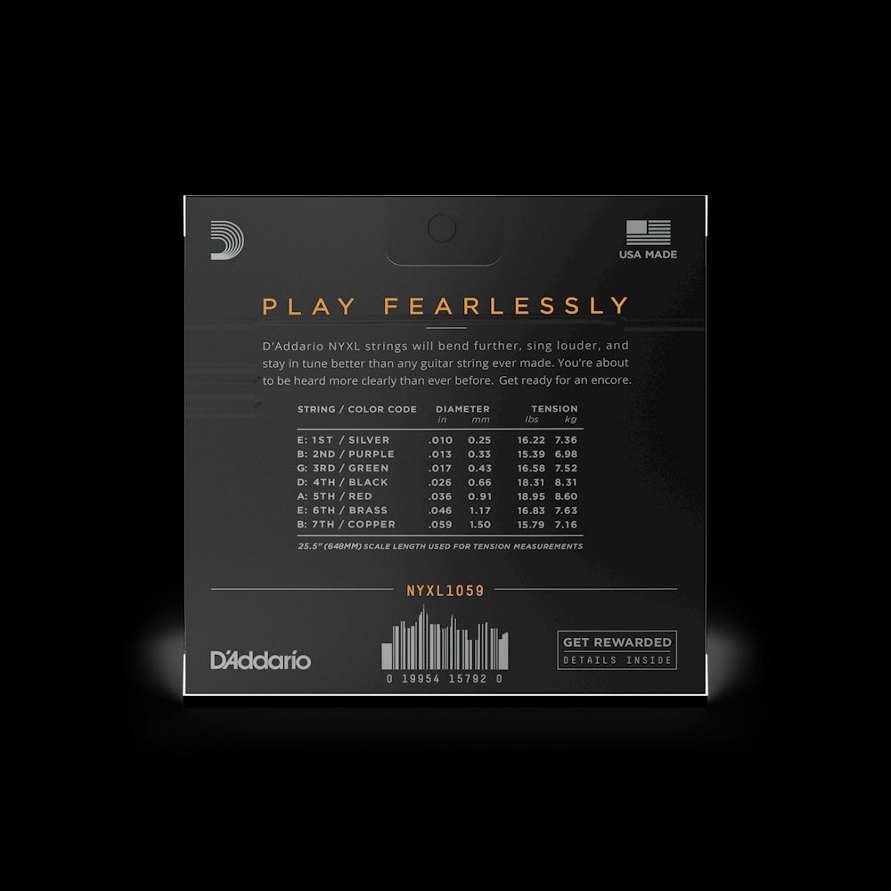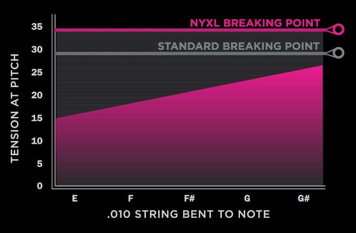 NYXLシリーズは、これまで市場に出たどの弦よりもチョーキング強度が向上、大音量かつチューニング安定性の優れた弦です。ニューヨー クに拠点を置くD'Addario社によって考案、開発、製造されたこの新しい弦は、芯線とプレーン弦に破断強度に優れた高炭 素スチール(HCS)を採用、プレイヤーにこれまでにないレベルの演奏性、安心感、パワーを提供するものとなっています。新しく考案された伸線工程と革新 的なワイヤーより合わせ(fusion twist)工程により、従来の弦よりも強度がアップ、チューニングの安定性は 131%向上しました。配合が見直されたニッケルメッキ製の巻き弦を使用、高い磁気性によるアウトプット増で中域が強調され、存在感のあるクランチの効いたサウンドになっています。