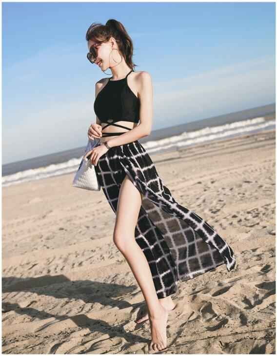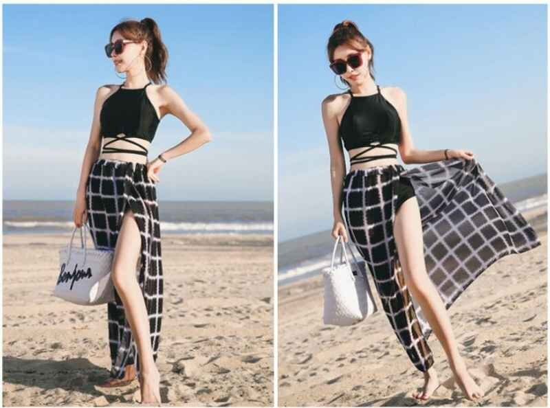 レディース体型カバー水着 3点セット ビキニ 海水浴 温泉 スイムウェア M ブラック