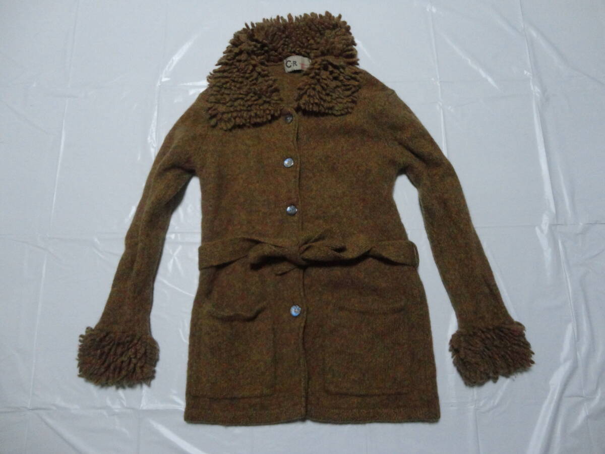 襟、袖裾のボンボンデザインが可愛く特徴的で、優しく落ち着いた色合いが印象的なニットコートです。