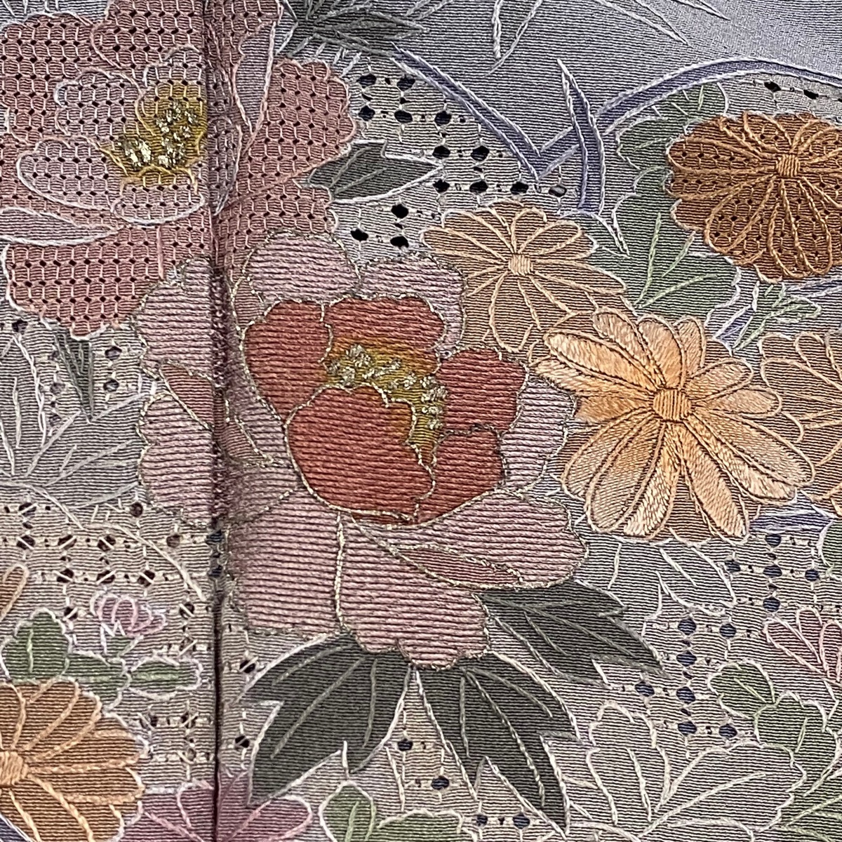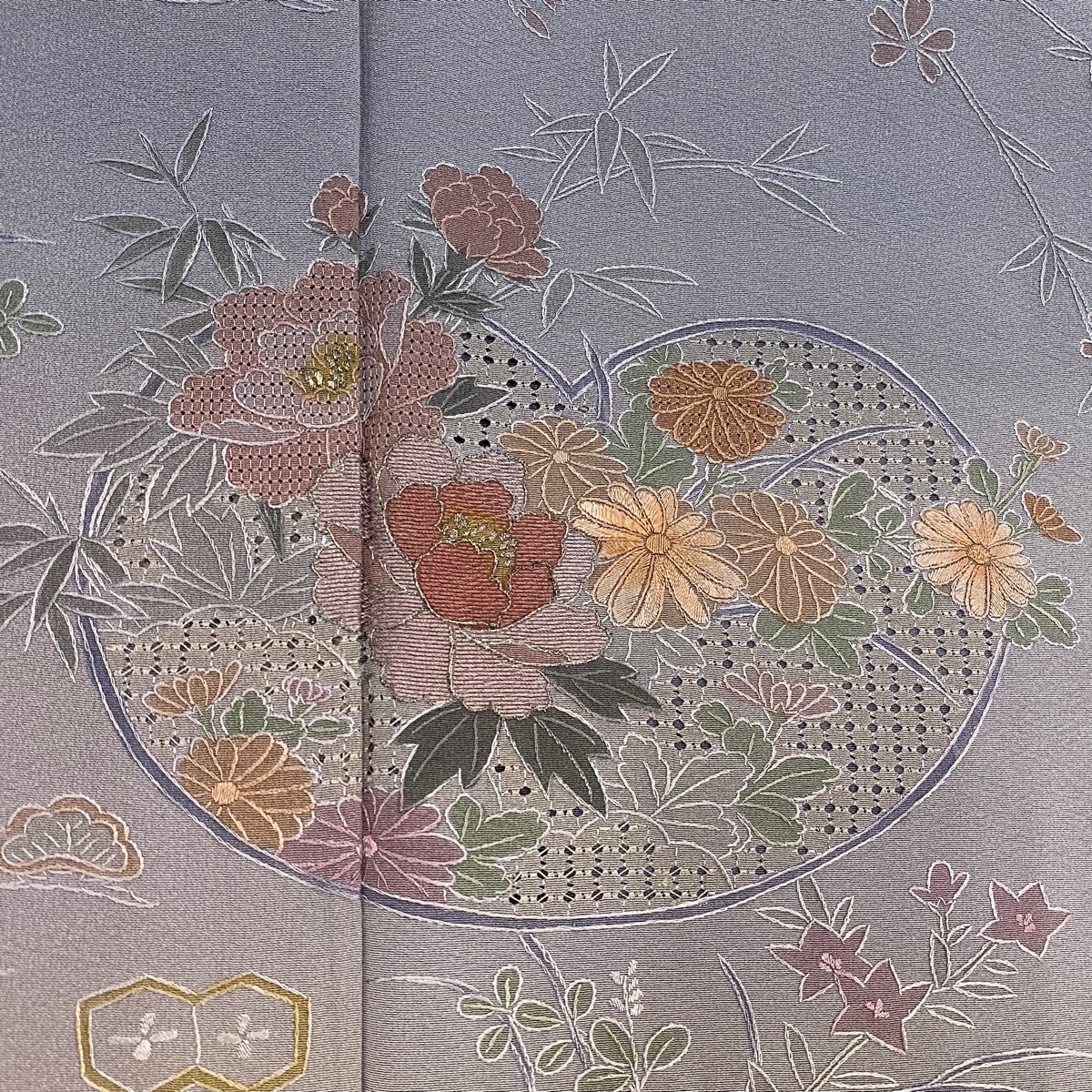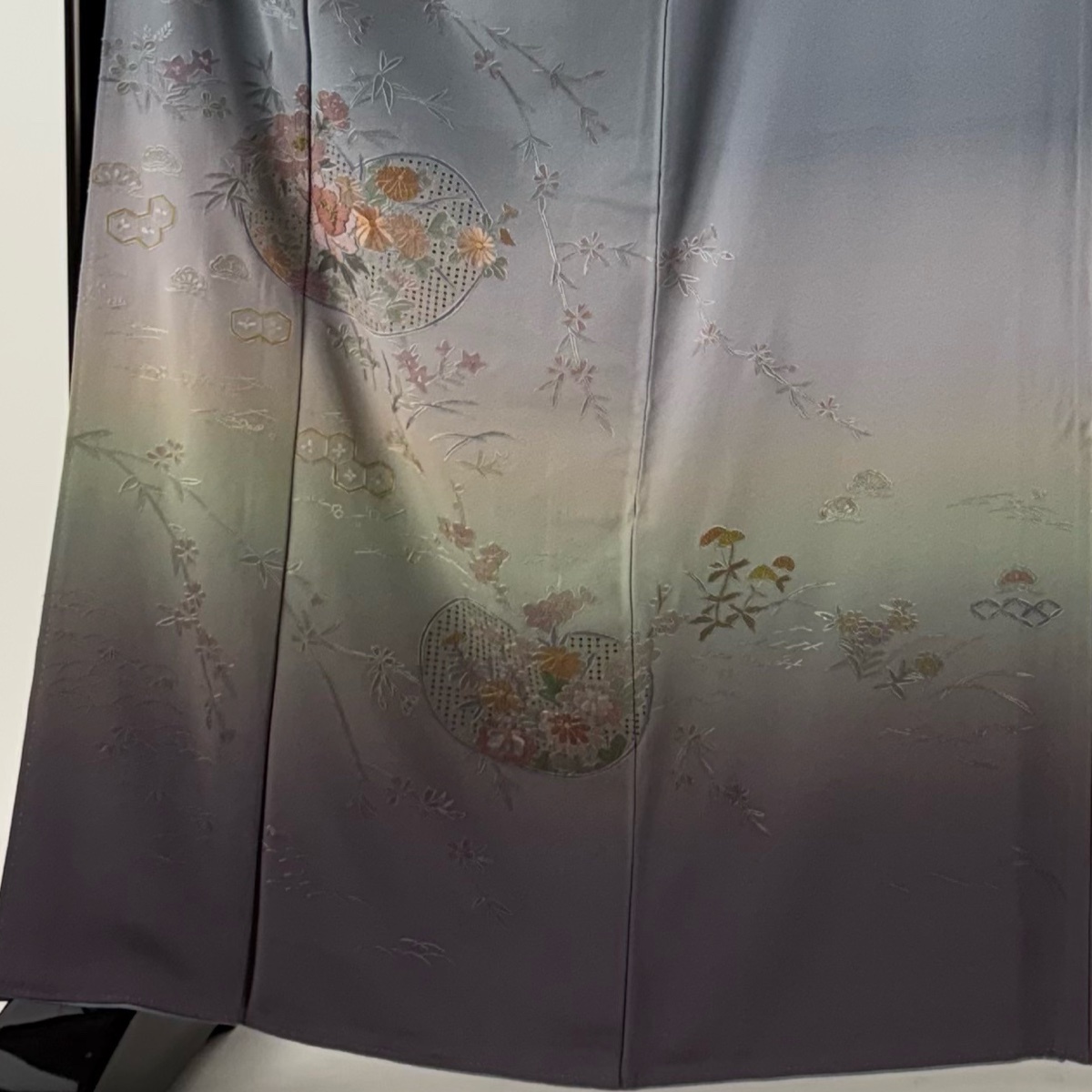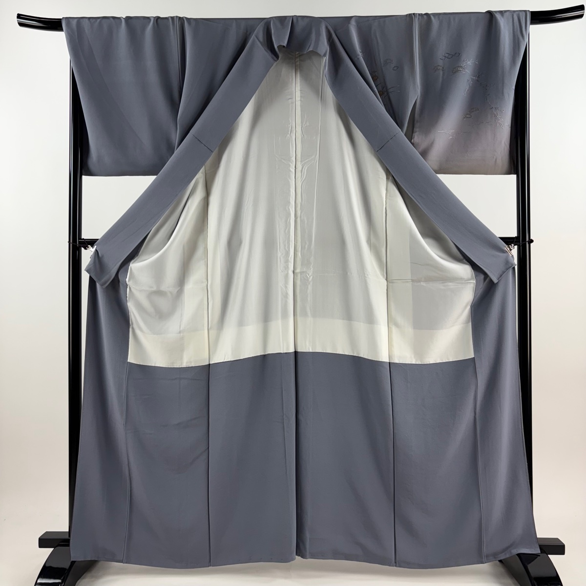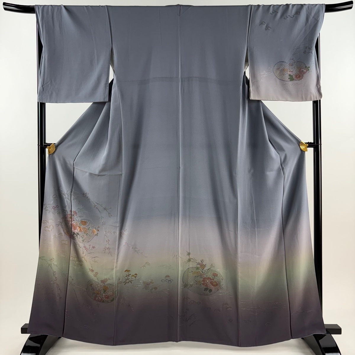 | 付下げ 秀品 団扇 草花 刺繍 金糸 青灰色 袷 身丈164 裄丈68 L 正絹 【中古】 |