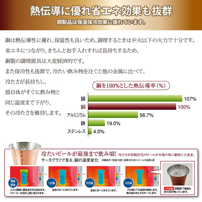 銅は鉄の5倍、ステンレスの25倍もの熱伝導率の良さを誇ります。