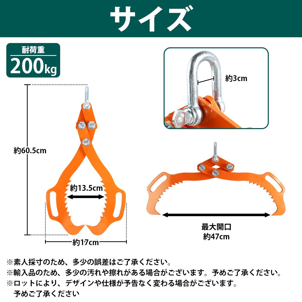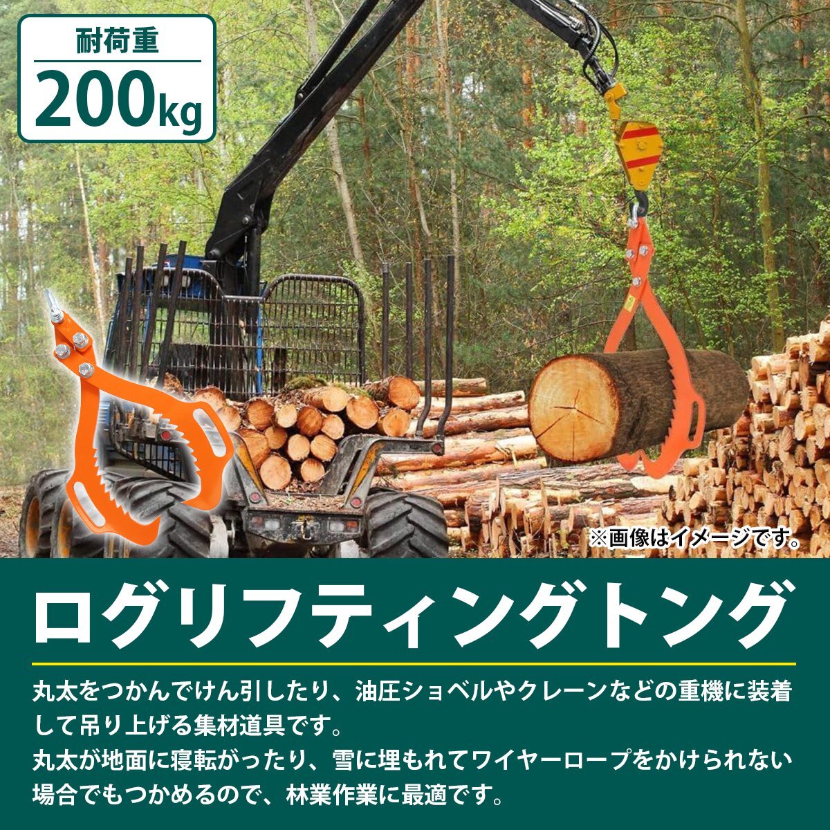 商 品 説 明丸太をつかんでけん引したり、油圧ショベルやクレーンなどの重機に装着して吊り上げる集材道具です。