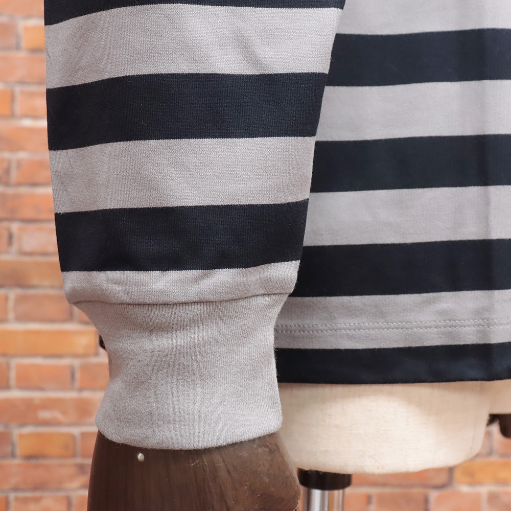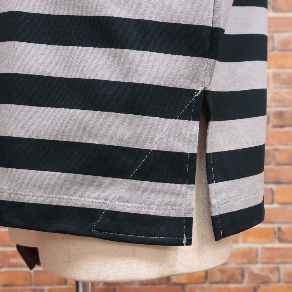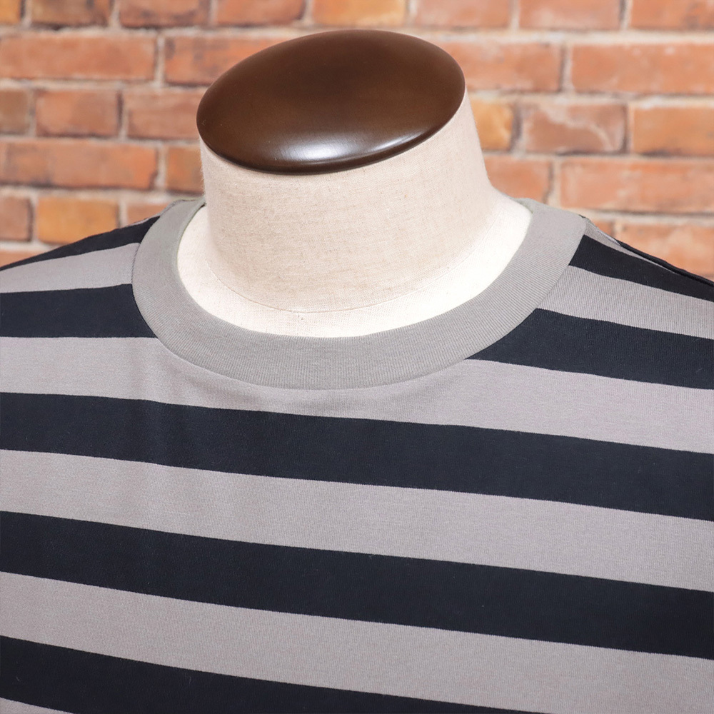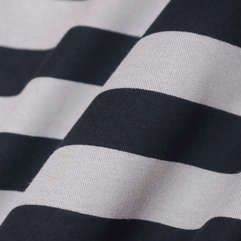 大きめの身幅にドロップショルダー、袖口はリブ仕様でラフに着こなせる長袖Tシャツ。ハイゲージに編むことでハリ感と光沢感が生まれる素材を使用し、カジュアル感がありながら上品に見えるボーダーを表現しました。オリジナル配色のボーダー柄と程よい厚みで、シーズンレスに活躍。首元はバインダーネックで耐久性に優れた仕上がりです。左裾には内側に眼鏡拭きをあしらったクリーンスリットも備え、実用性も◎。シンプルながらスタイリングの幅が広がるアイテムです。