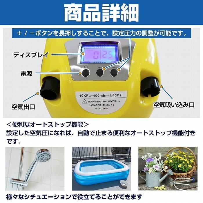 ●設定した空気圧になれば自動で止まる便利なオートストップ機能付き!