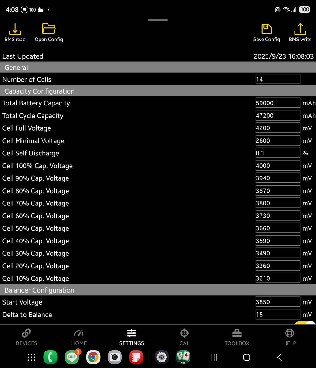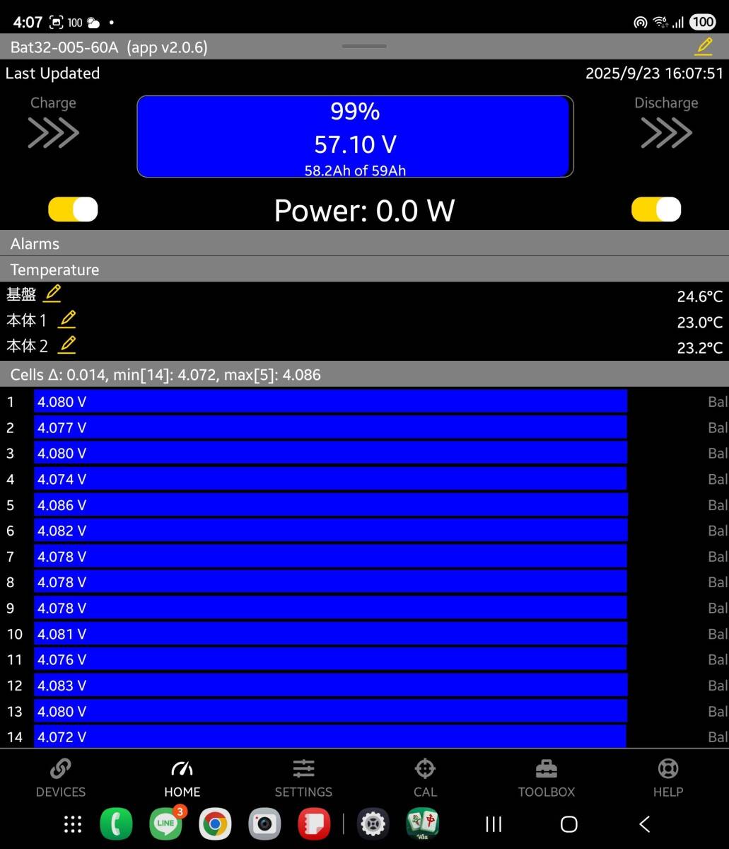不具合があった時は出力はカットされ、スマホで原因を確認ができ、各セルの電圧、セルの最高電圧、最低電圧、気温による放電電圧、充電電圧も設定出来ます。