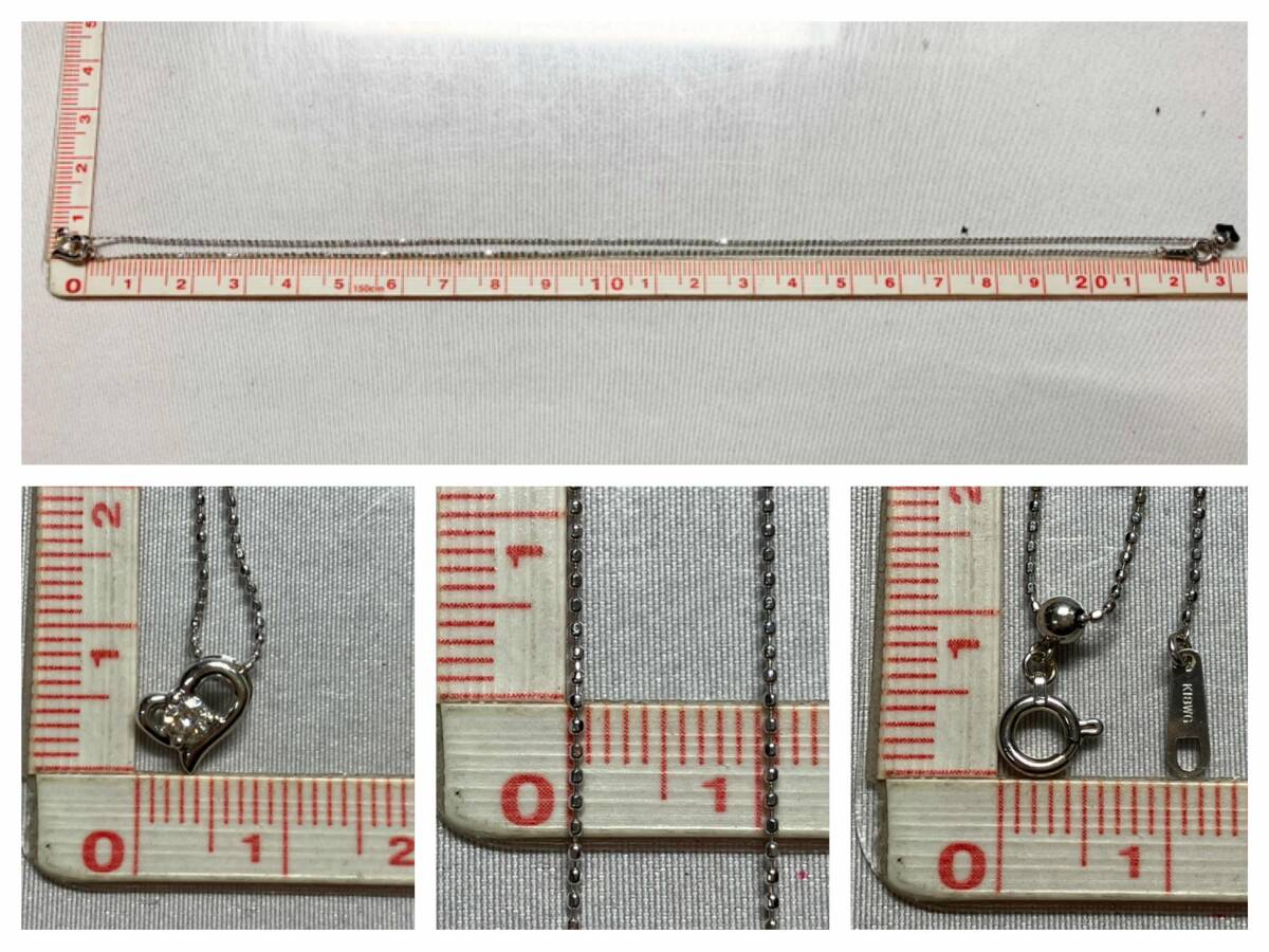 チェーン全長:約 46cm 高さ:約 0.8cm 幅:約 0.8cm 総重量:約 2.0g サイズ表記(~cm位)は目安です。ブランドやデザインによって多少前後する場合がございます。予めご了承の上ご注文ください。 ![]() | ||||||