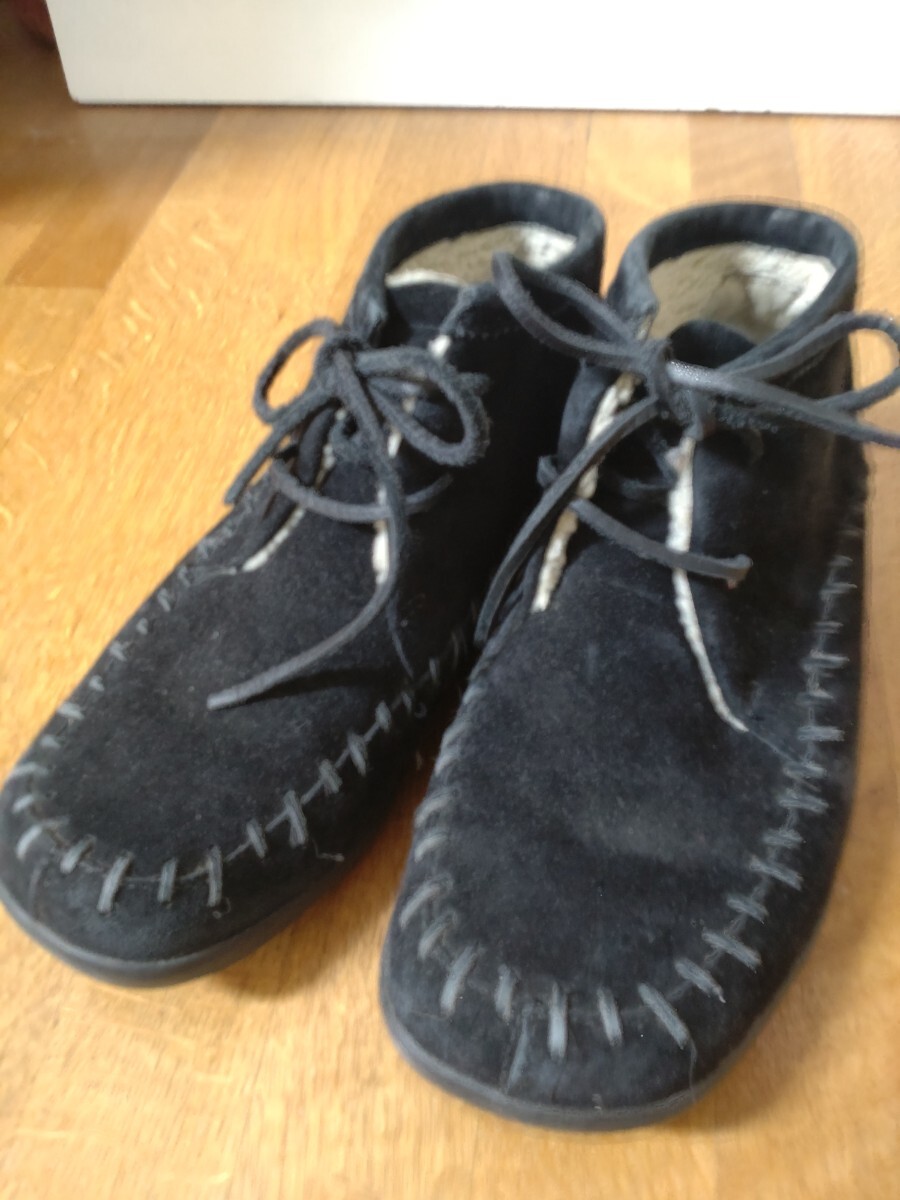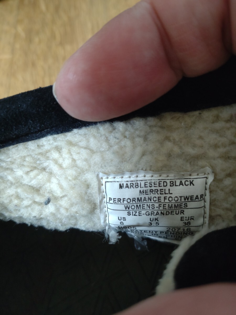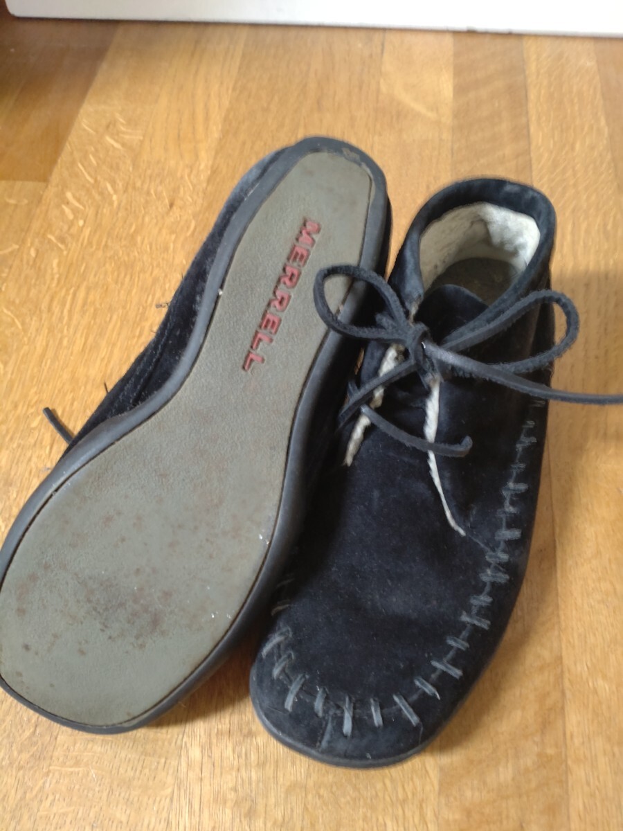 MERRELL メレル スェードレースアップ 23センチ モック 暖か スエード素材のブラックレースアップブーツ、 底は厚みがありかかとの後ろのガードの上くらいまであります。 ボア付きで暖かく、紐でフィットさせるので、履きやすいです。 底ヘリ、ごくわずかです。