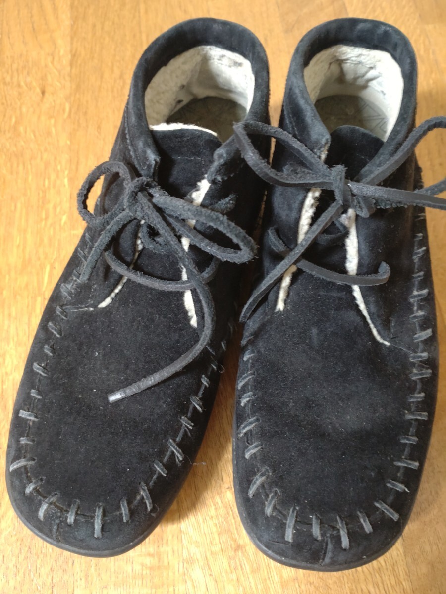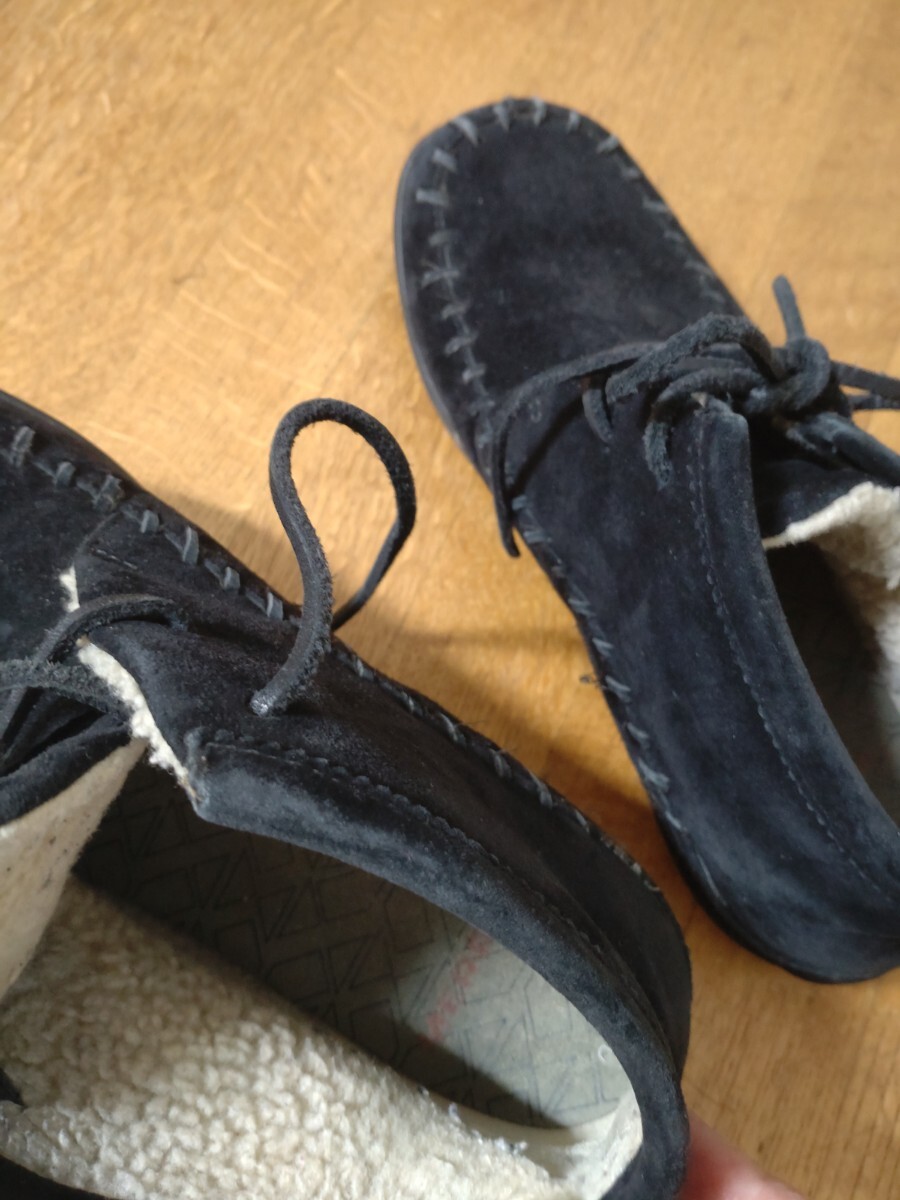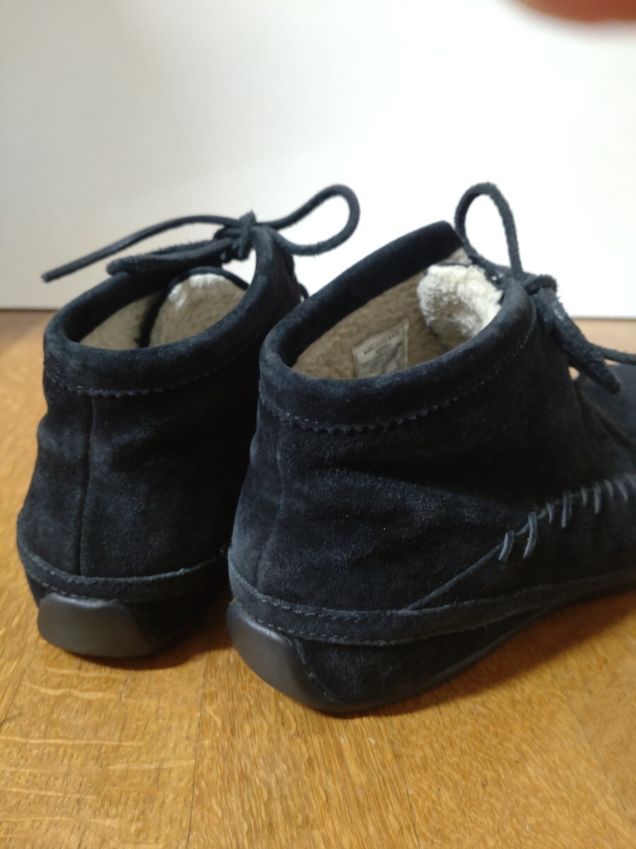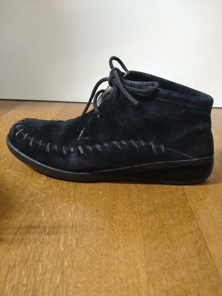 MERRELL メレル スェードレースアップ 23センチ モック 暖か スエード素材のブラックレースアップブーツ、 底は厚みがありかかとの後ろのガードの上くらいまであります。 ボア付きで暖かく、紐でフィットさせるので、履きやすいです。 底ヘリ、ごくわずかです。