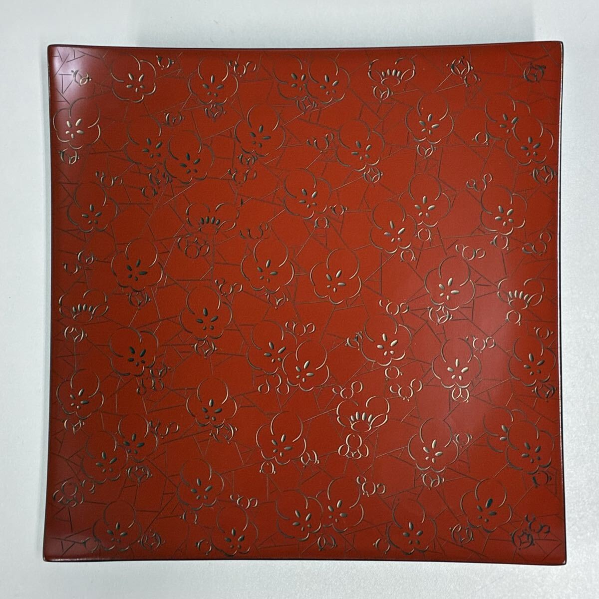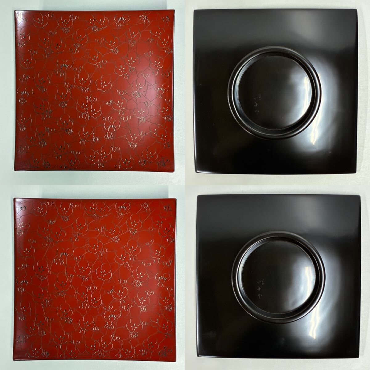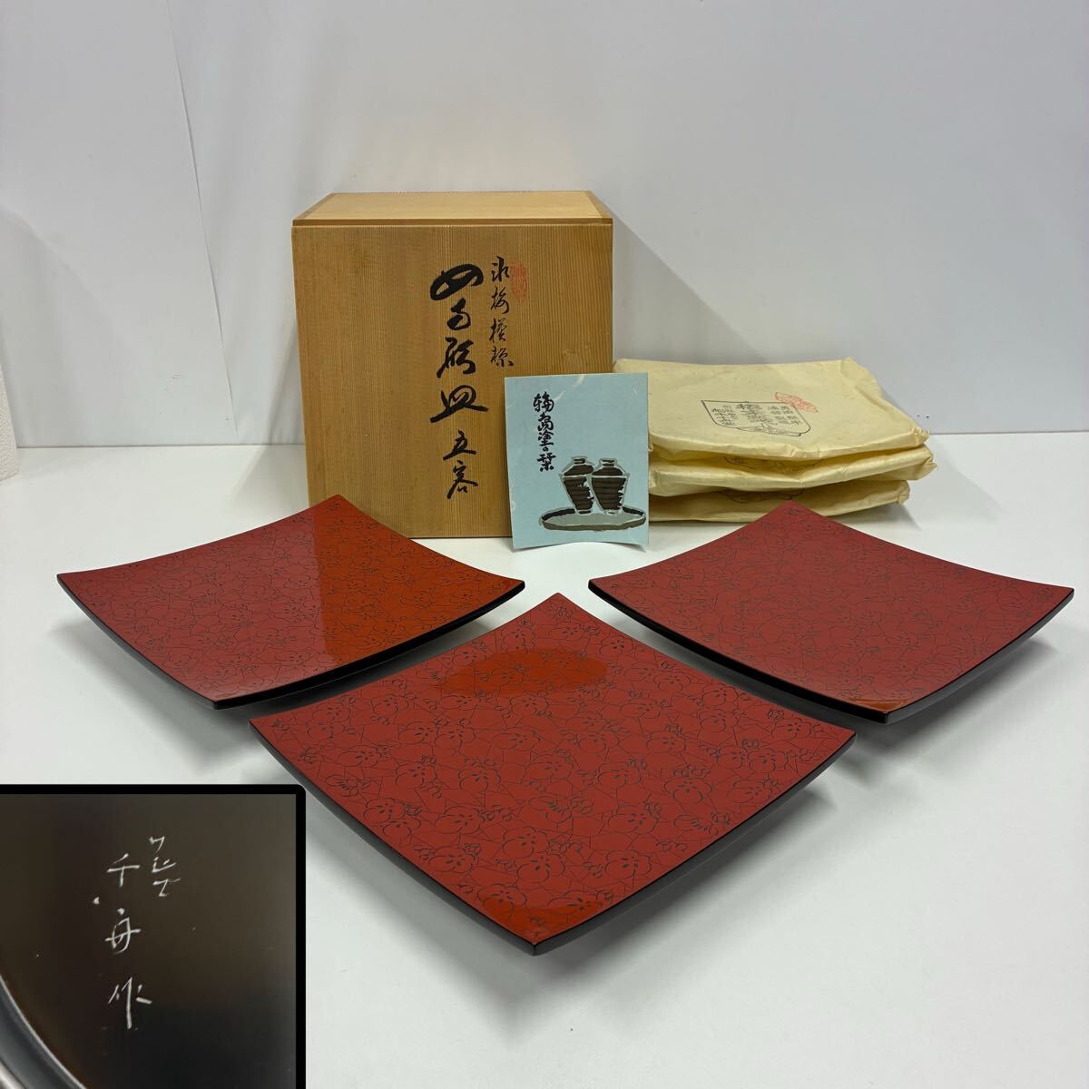 | 輪島塗 船木千舟堂 梅模様 四方皿 3客 共箱 幅約19.6×19.6cm 高さ4cm (管理番号t-61) |