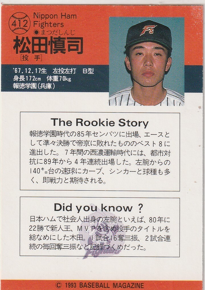 ●1993BBM 【松田 慎司,山原 和敏】 ルーキーカード 2種 No.412,413:日本ハム