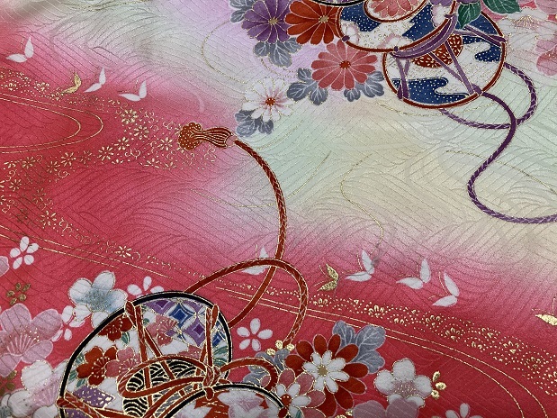 113.昭和レトロ◆正絹・中古◆美品 流水に菊花鼓 ひらひら蝶づくし織り出し 可愛い女の子着物 ◇丈127センチ裄54.5+2袖74センチ