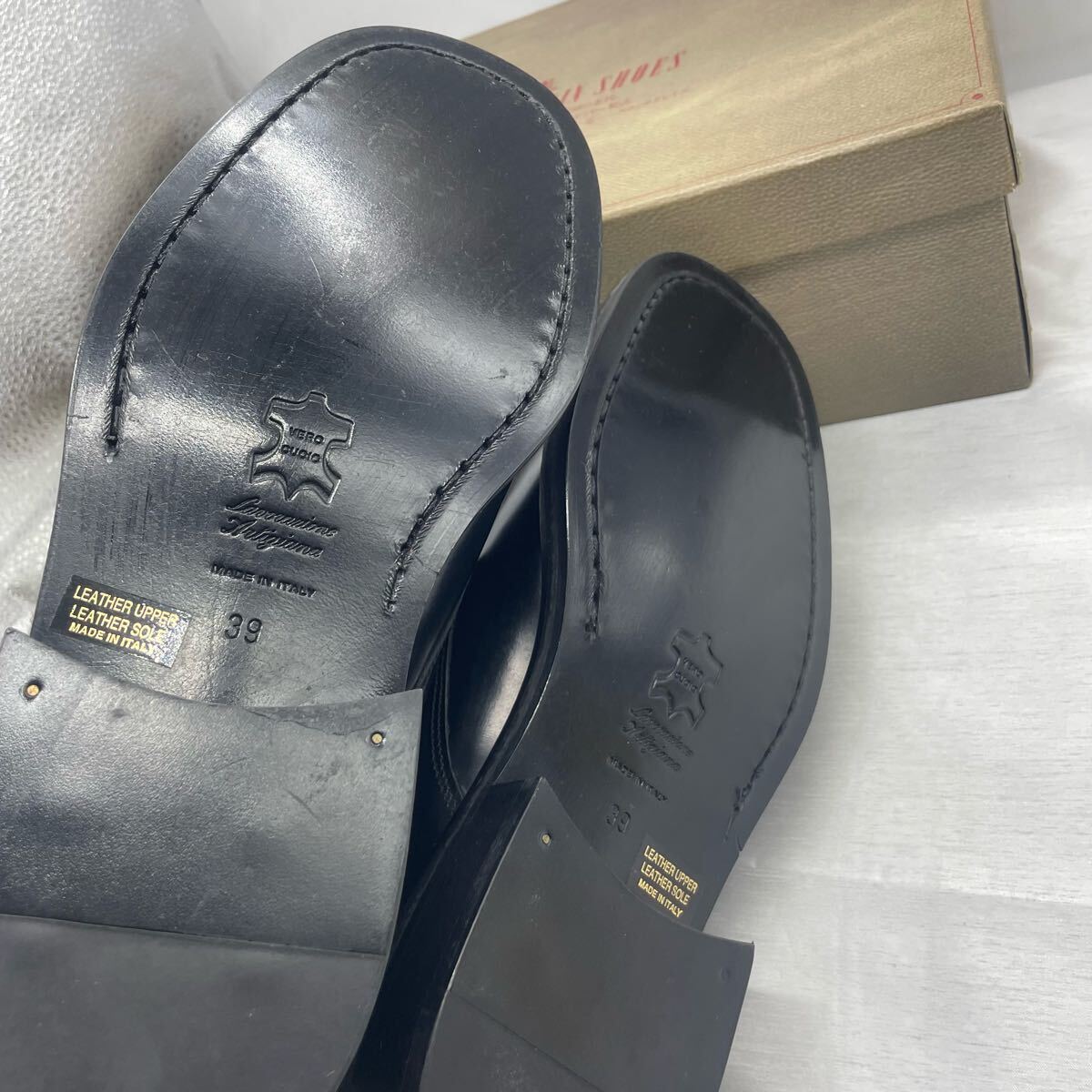 イタリア製で、品質の高さを感じられる一足です。サイズは39(約24.5cm相当)となります。