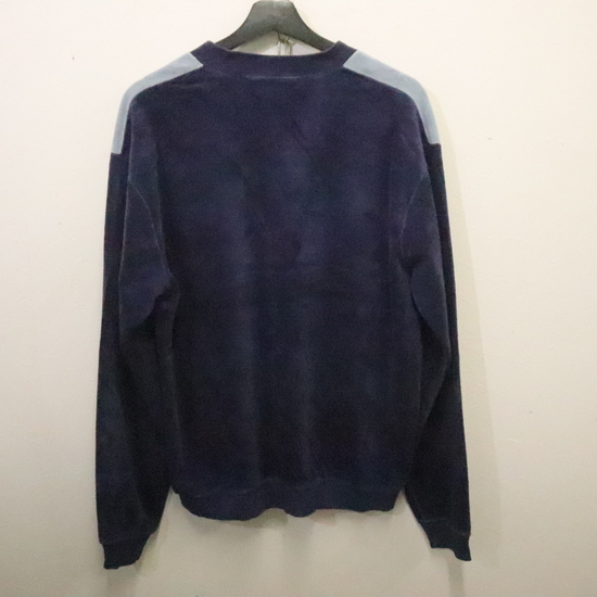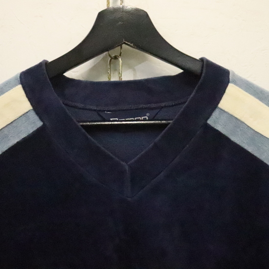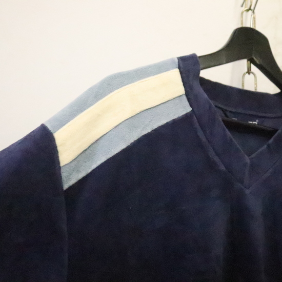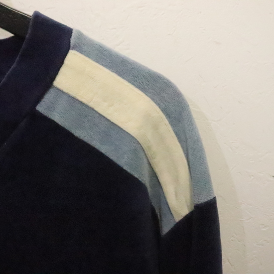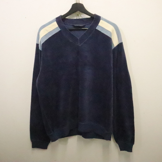 商品名 e911 80sビンテージ Damon 長袖ベロアトップス■1980年代製 表記XLサイズ ネイビー Vネック マルチカラー アメカジ ストリート 古着 古着卸