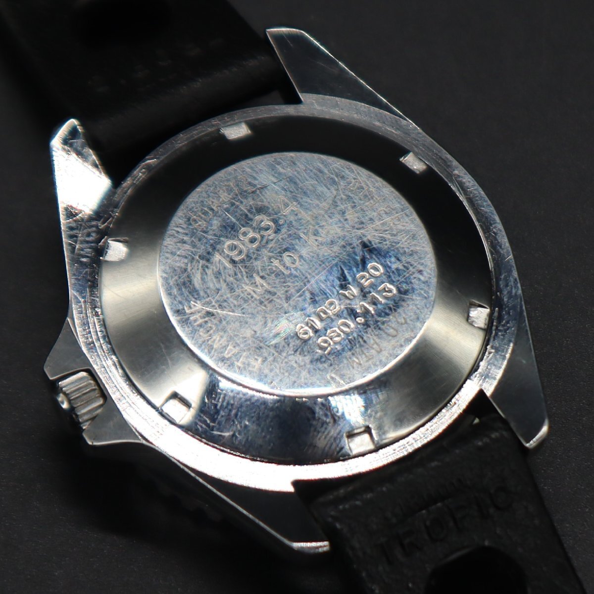 不動の為、ジャンクで出品します。 ジャンク品ですので詳細は全て未確認です。 ねじ込み式リューズをほどき、針が回ることのみ確認しております。 ホイヤー社とタグ社が合併する直前の希少な「TAG」表記のない 「HEUER」表記のみのダイバーズウォッチです。 全体にスレ・線キズ・小汚れ・打痕キズ、 ガラスに線キズ、針に小傷み見受けられますが、 文字盤は目立った傷みは無いように見受けられます。 裏蓋に「1983.4/MtoK」の刻印ございます。 ※画像7枚目をご確認ください。 ベルトは使用感少なく、比較的良い状態です。 純正尾錠、小キズございますが、ロゴ鮮明です。 ジャンクとして出品しておりますので、 詳しくは画像にてご判断ください。 |