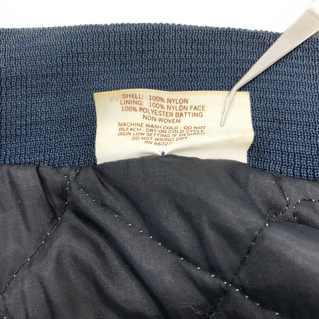 【商品管理番号】 V2900 【サイズ】 XL 【実寸サイズ】 着丈:約67cm 身幅:約69cm 裄丈:約93cm 袖下丈:約51cm 【主な素材】 表地 : ナイロン 裏地 : 13848 中綿 : 13897 【色】 ネイビー 【仕様】 生産国 : USA製 80年代 【状態】 汚れ:袖、袖先、背中、裾 キズ:肩、袖 |