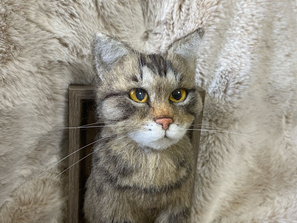 羊毛フェルト等を使用して、フレームから飛び出してお座りしているキジトラ猫ちゃんのオブジェを作成しました。