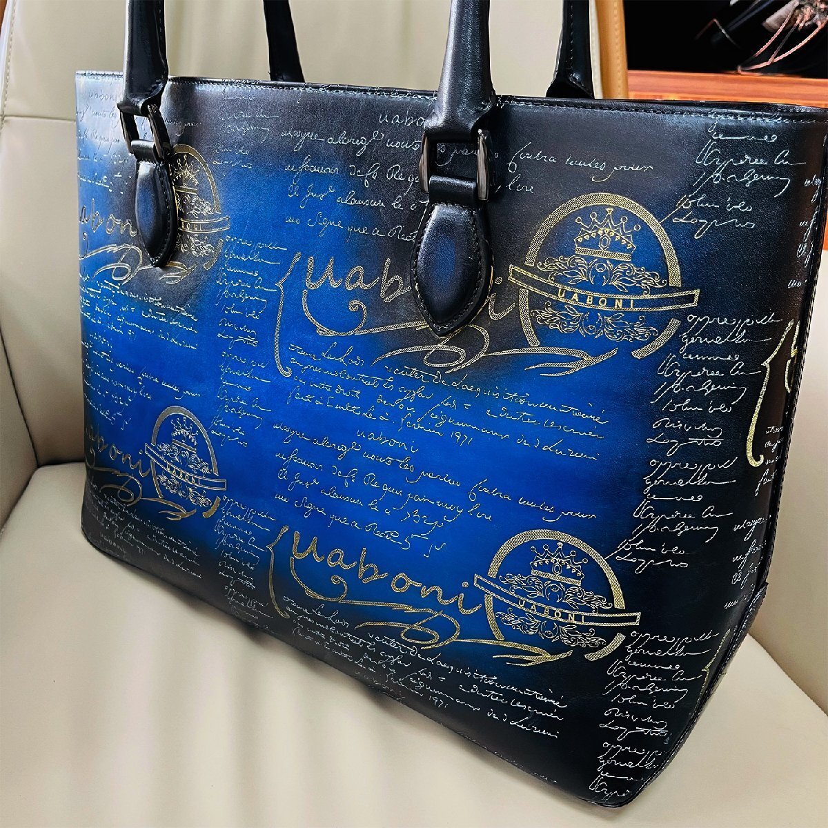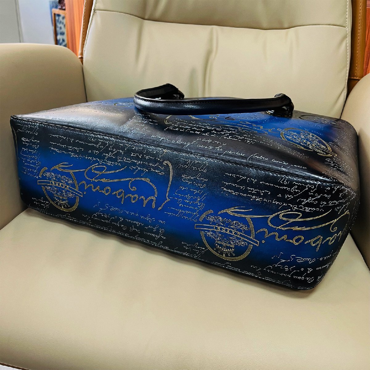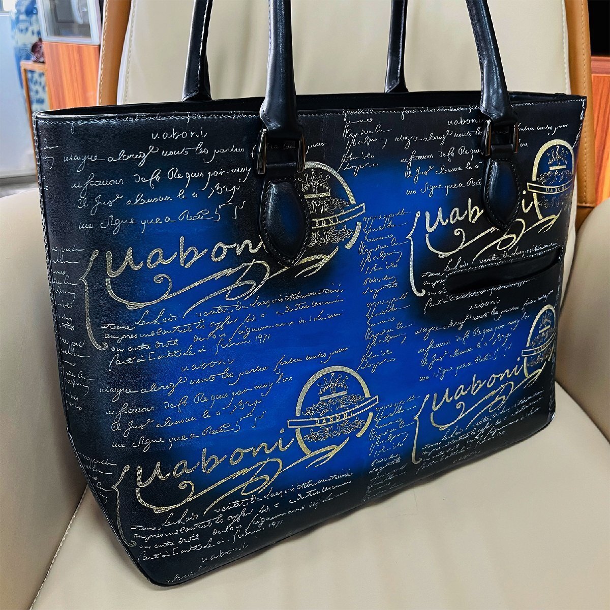 手触り感触が良くアンティーク風なトートバッグと仕上がりました。角の部分は丸みを帯びた設計になっており、全体的にカリグラフィーとゴールデン/シルバーパティーヌがデザインされております。色艶、柔かさに優れていて高級感溢れる逸品となります。