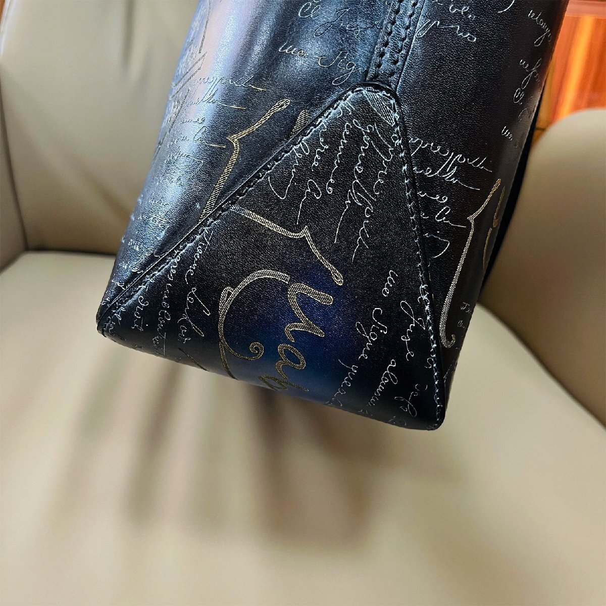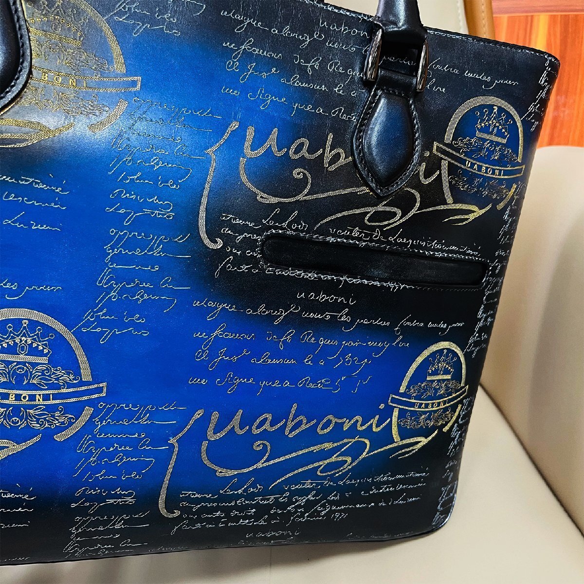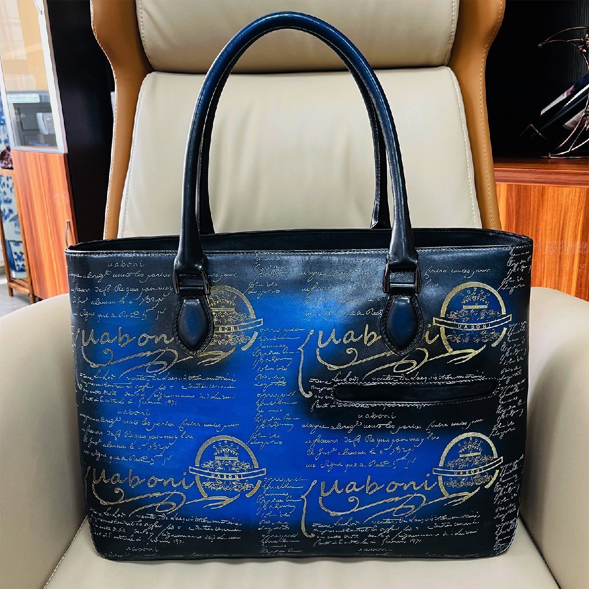 手触り感触が良くアンティーク風なトートバッグと仕上がりました。角の部分は丸みを帯びた設計になっており、全体的にカリグラフィーとゴールデン/シルバーパティーヌがデザインされております。色艶、柔かさに優れていて高級感溢れる逸品となります。