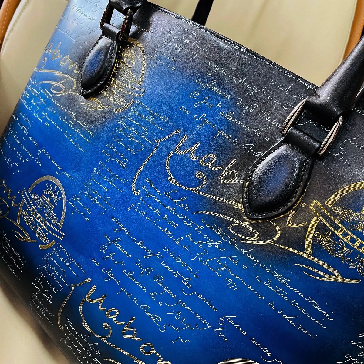 染料の開発成功は製作の一番重要な問題の解決に繋がり、職人が一つ一つの工程にこだわり作り上げた牛革トートバッグです。一番こだわりの工程はカリグラフィーの彫り込みと革の着色です。