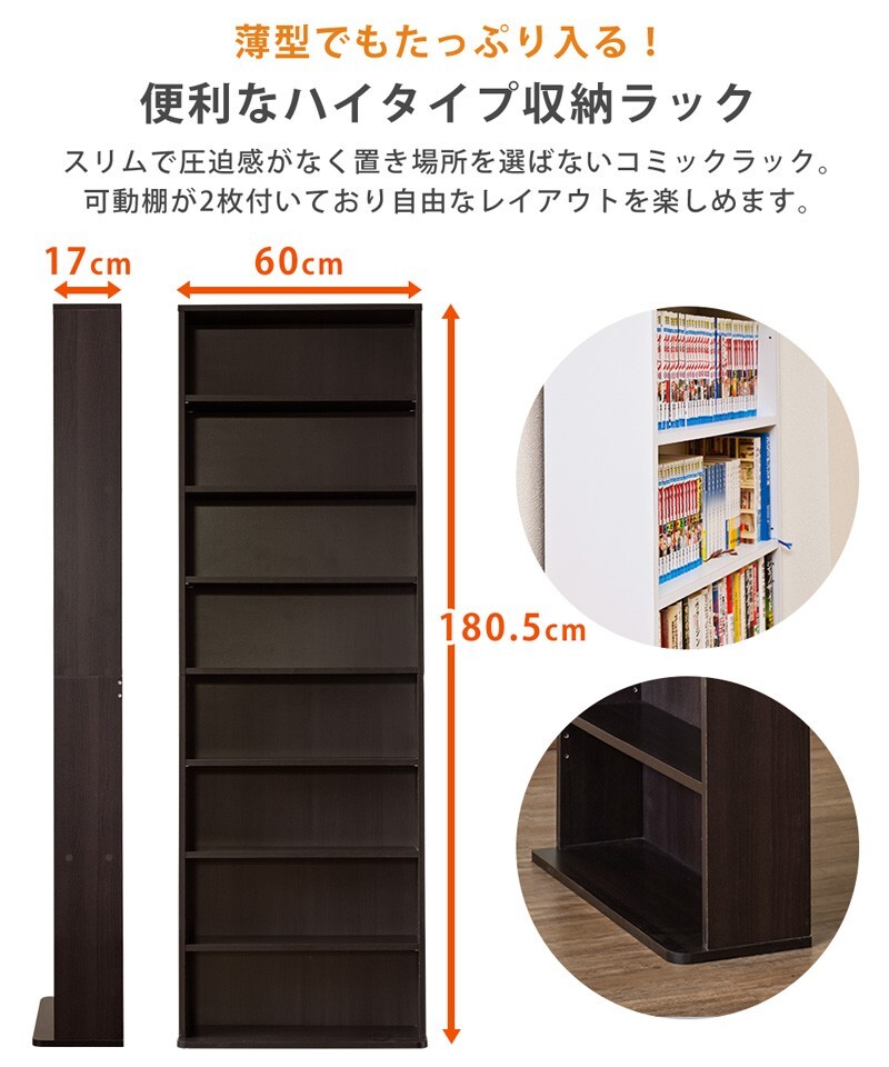 商品説明 | 組立品(約25分) 薄型でもしっかり収納! コミックやDVD以外にも見せる収納として使えるラックです! 薄型で邪魔にならないハイタイプのコミックラックです。 コミックやDVDの他、コレクションなどの飾り棚として使ってもいいですね。 ネジ隠しシールも付いて見た目もスッキリ! 【メディア別収納数】 コミック:約320冊 DVD:約296枚 CD:約432枚 |