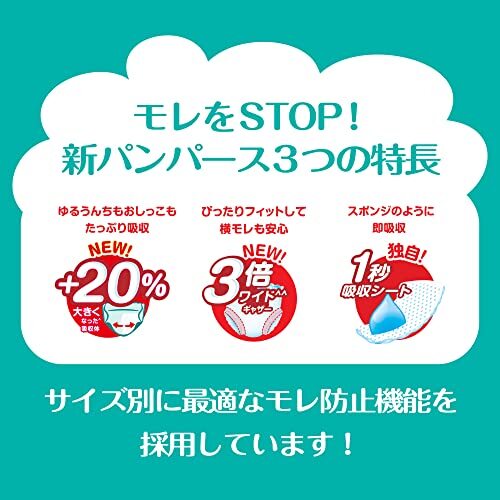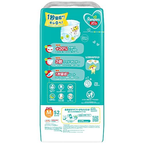 ・ Mサイズ (52個) 4987176136152・PatternName:1)52枚(Mサイズたっち)・新発売!たっち用さらさらケアパンツ(6-12kg)。3倍ワイドギャザー*と+20%大きくなった**吸収体でモレ0へ!・New! 3倍ワイドギャザー*脚の付け根までカバーして、横モレ0へ!*従来品比較・New! +20%大きくなった**吸収体 吸収スピードがさらにUP!おしっこも、ゆるうんちも、モレ安心。**従来品比較・独自! 1秒吸収***シート スポンジのように即吸収、お肌さらさら。***平均尿量に基づく(P&G調べ)2回のおしっこを想定・最長12時間。一晩中の吸収力説明 新改良! パンパースさらさらケアパンツはモレ0へ。パンパースなら思いっきり遊べる! +20%大きくなった*吸収体と3倍ワイド*ギャザーで横モレ防止。オムツ New! +20%大きくなった*吸収体でおしっこも、ゆるうんちも、モレ安心。 New! 3倍ワイド*ギャザー! 脚の付け根までカバーして、横モレ0へ! 独自! 1秒吸収**シートスポンジのように即吸収、お肌さらさら。 New! ふわっとドライ吸収シート 独自! さらさら風通しライン 2.5倍***伸びる のびのびベルト 12時間の吸収力 *従来品比較**平均尿量に基づく(P&G調べ) 2回のおしっこを想定***伸びる前との比較