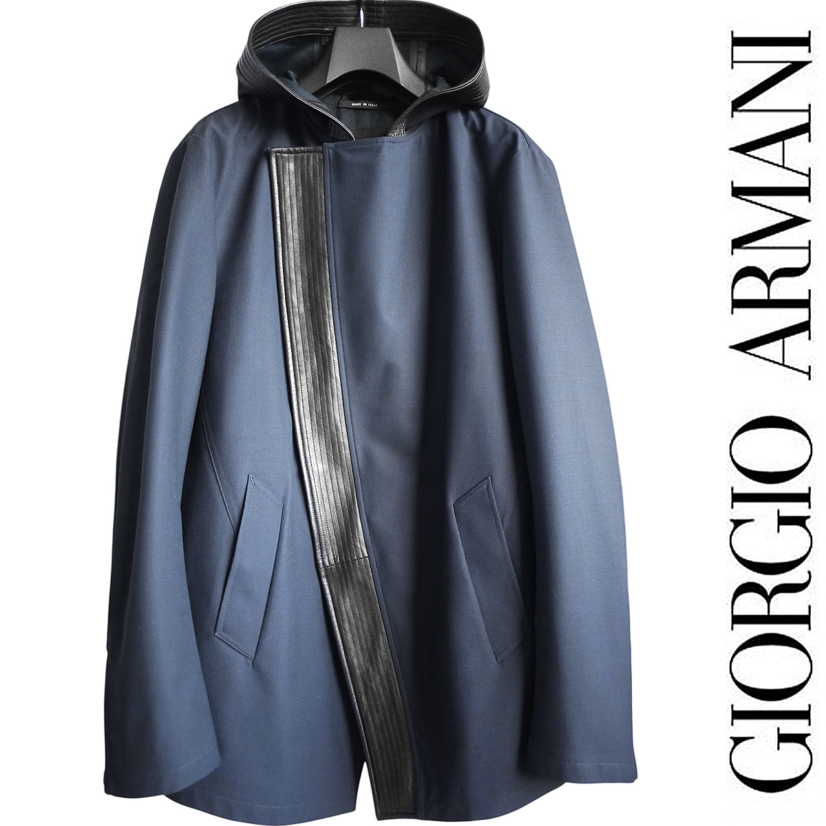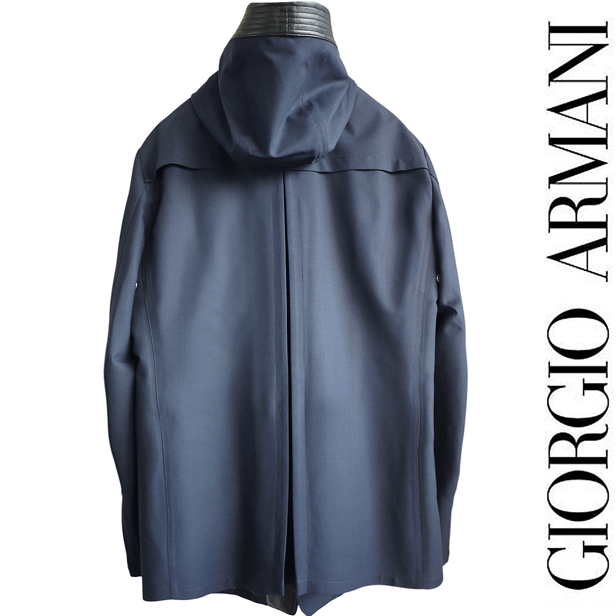 GIORGIO ARMANI のウールフーデッドラッピングコートでございます。近年のトレンドであるドロップ気味のショルダーでコンパクトながらリラックスしたプロポーションのモダンなデザインのコートです。数あるアルマーニのラインの中でも最も高級なファーストラインのブラックタグのジョルジオアルマーニのモデルでございます。