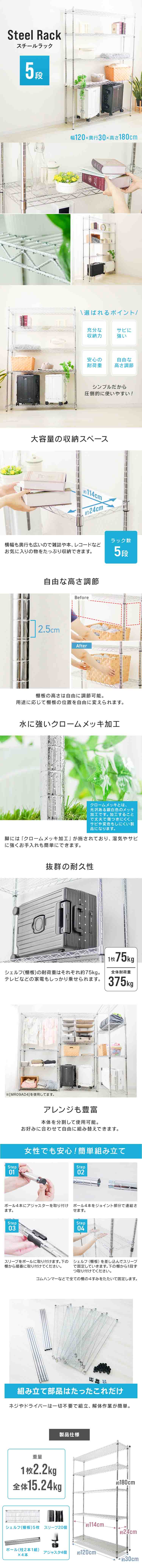 | どんなお部屋にも合わせやすいスチールラックです。 ぐらつき防止アジャスター付き! クギやネジを使わずに簡単に組み立て出来ます! 棚の高さを自由に変えることができます。 一人暮らしのお部屋やリビング、キッチン、物置など場所を問わず活躍できます。 アパレルショップの店頭用やオフィスにも使用されています。 【仕様】 サイズ(約):幅120×奥行30×高さ180cm 耐荷重(約):(全体)375kg / (棚板1枚あたり)75kg 材質:スチール(クロームメッキ)、ABS樹脂 他 重量(約):15.24kg 【商品内容】 シェルフ(棚板) ×5 ポール(ジョイント式) ×4 スリーブ ×20 アジャスター ×4 ※大型商品のため、特別中継料が適用されます。(北海道+1,100円/沖縄本島+2,200円/離島+2,200円) |