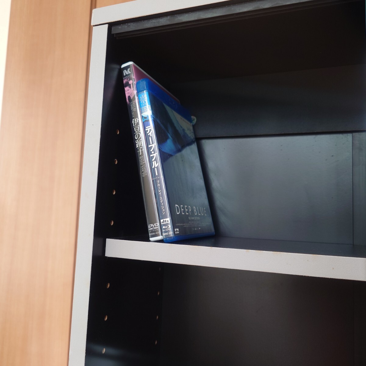 両面に棚があり大容量の収納が可能。 ブルーレイ、DVDの他、CD 文庫本が入ります。
