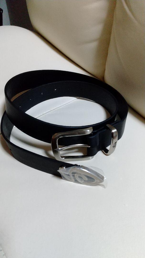 スタイリッシュなブラックレザーベルト、スチールバックル付き。スーツにもカジュアルにも様々なスタイルに合わせれるカッコいいベルトです♪