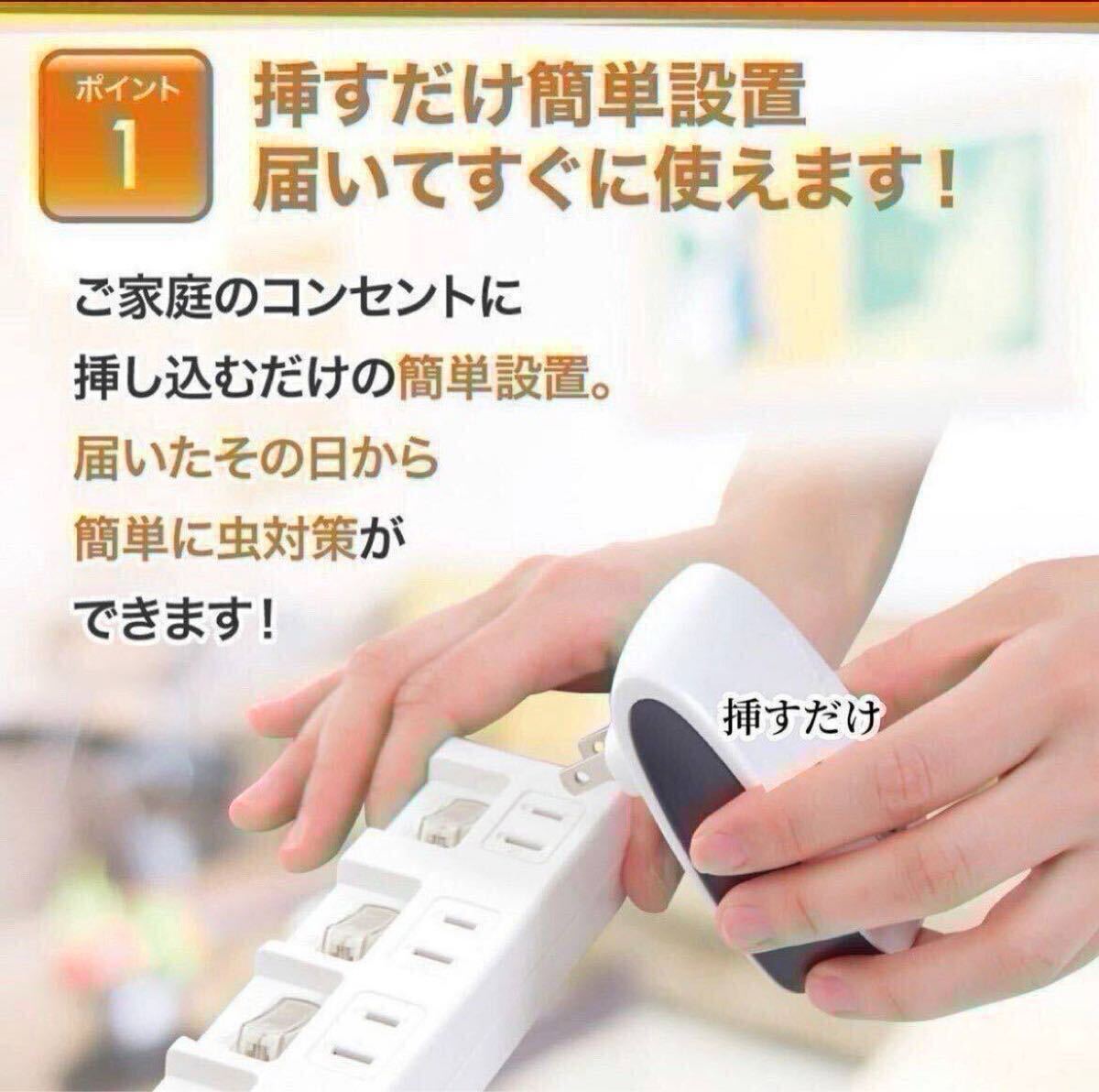 日本語の取扱説明書付き。薬品・煙・スプレーを使用せず、コンセントに差すだけでOK。電池や充電は不要です。