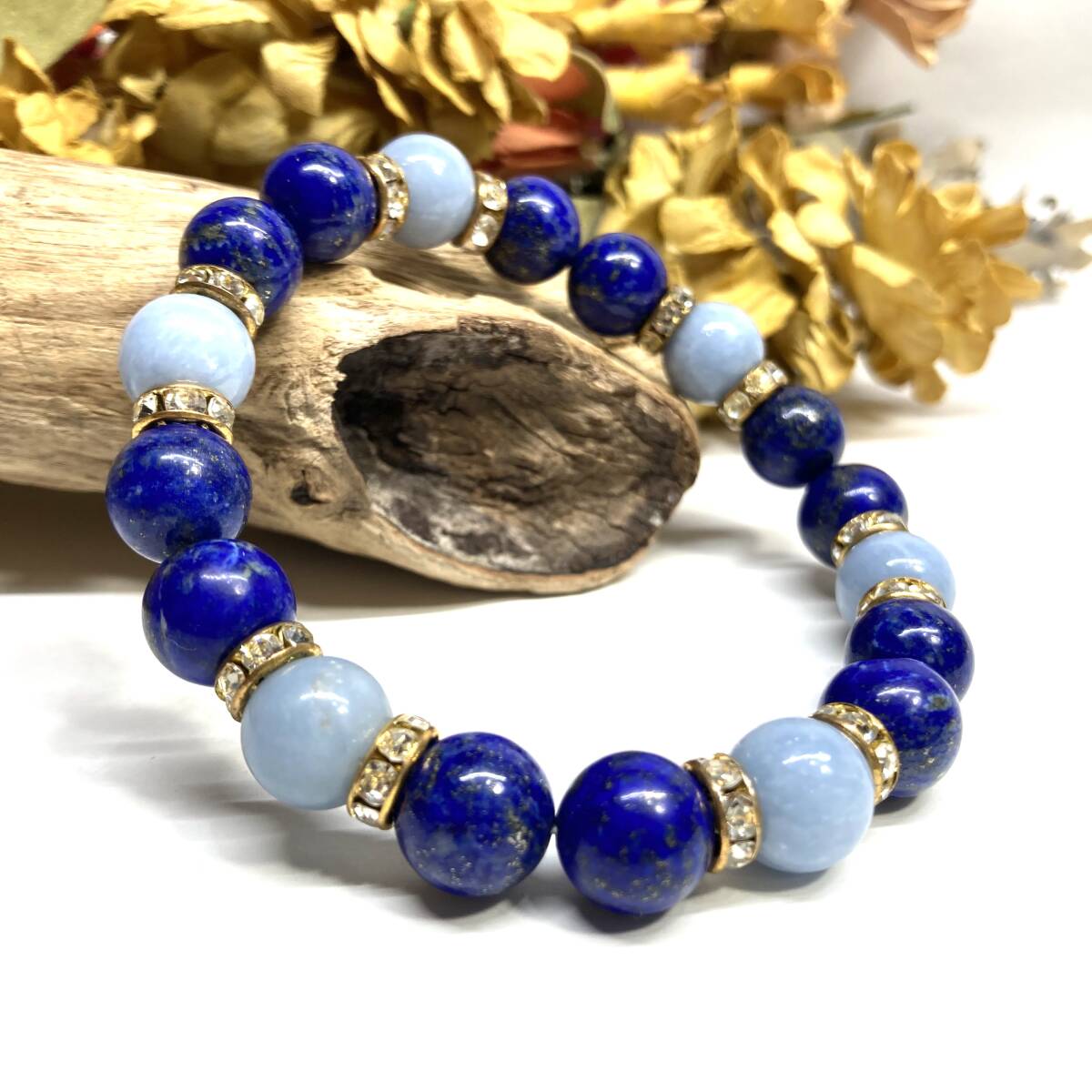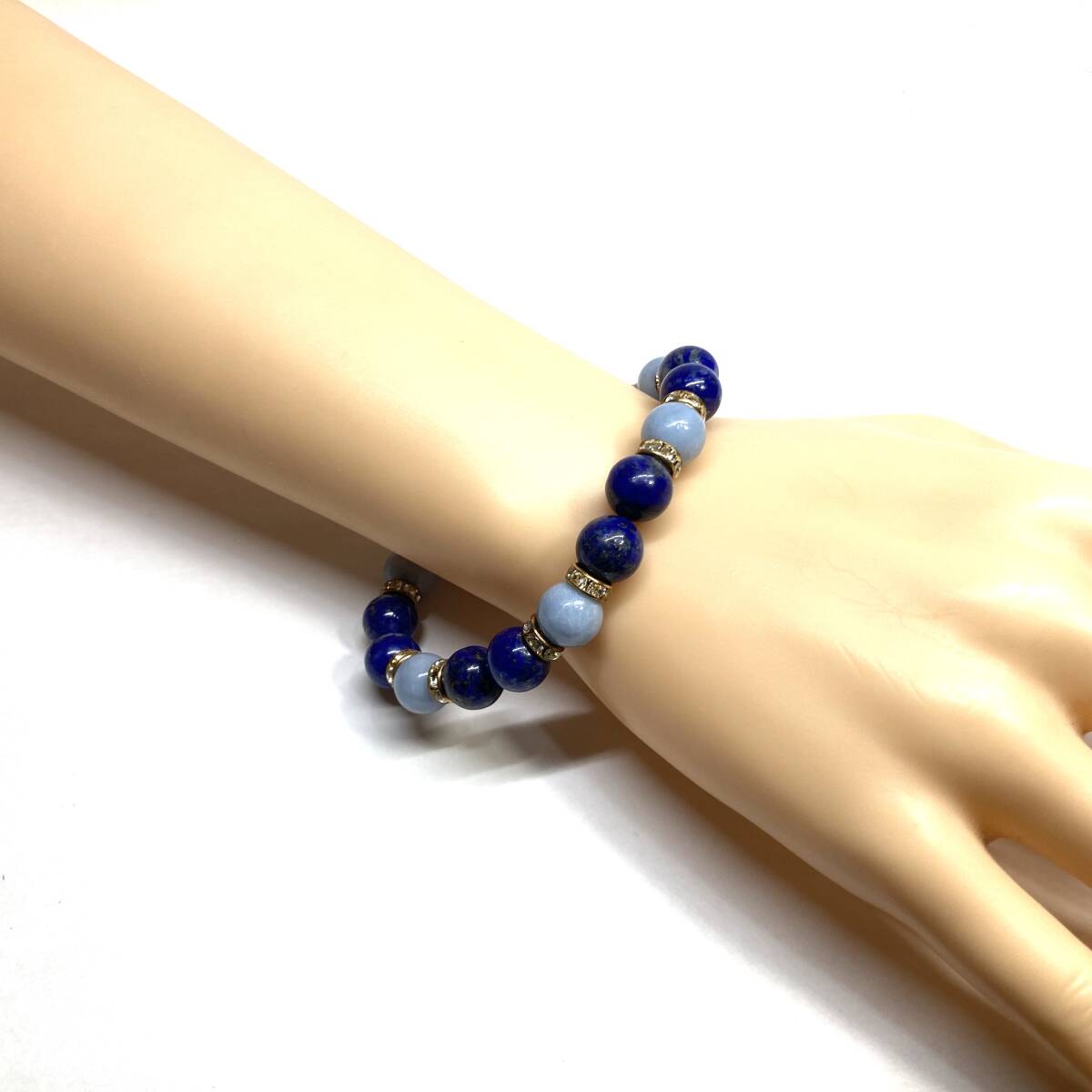 こちらは、ラピスラズリとエンジェライトを組み合わせたパワーストーンブレスレットです。間にはロンデルを挟み高級感あるデザインに仕上げております。石大きさは腕にも馴染みやすいように10mm玉で内径約18cm(伸可能)です。(サイズ変更の場合は取引ナビにてご連絡をお願いします。) 数に限りがございますので気になる方はお早めにどうぞ。