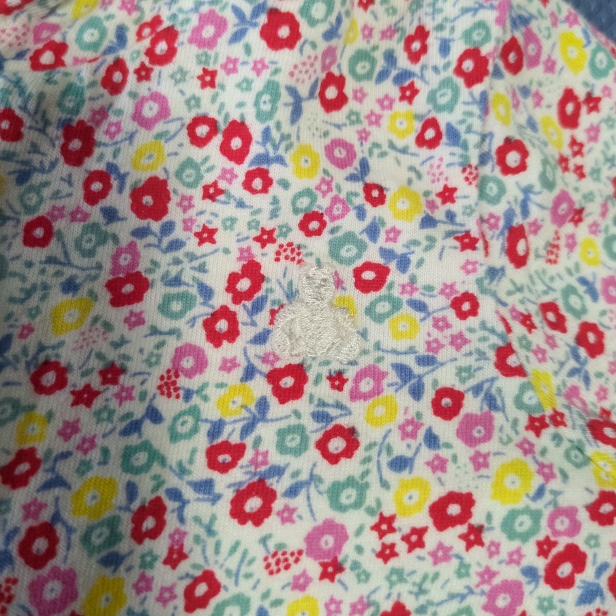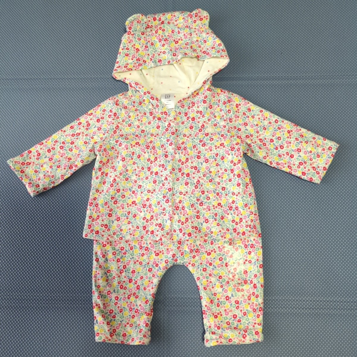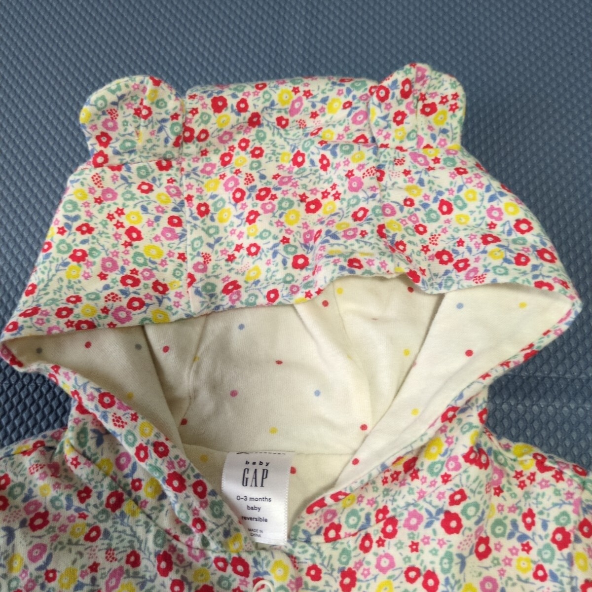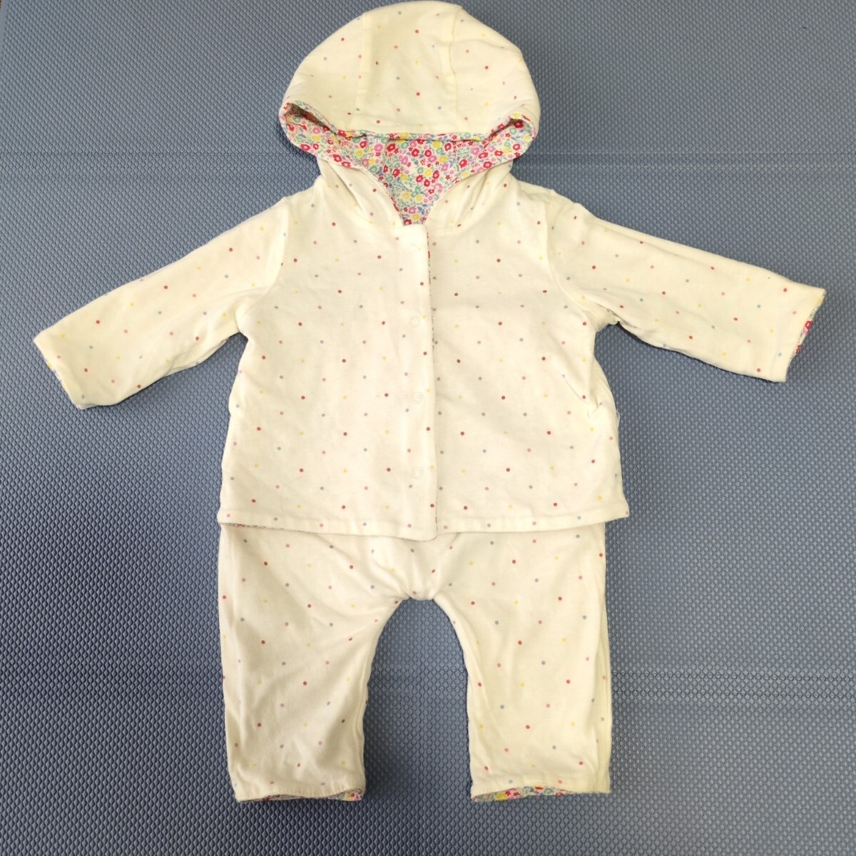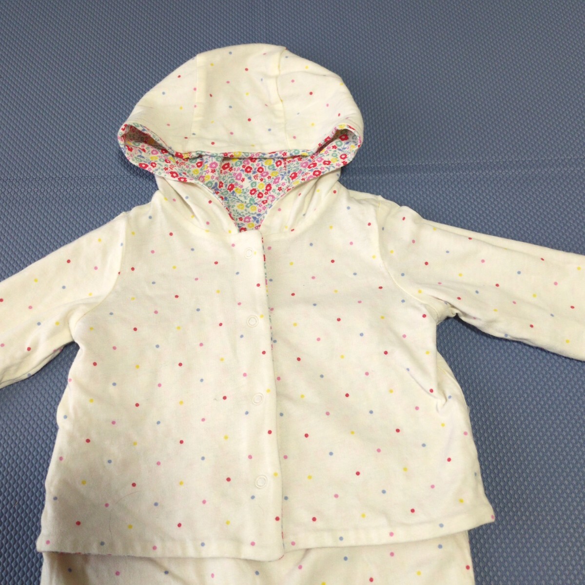 リバーシブル 花柄&水玉デザインのフード付き上下セット、ウサギの刺繍付き。