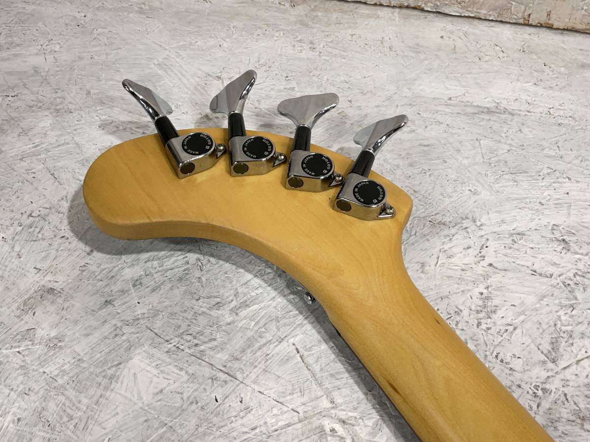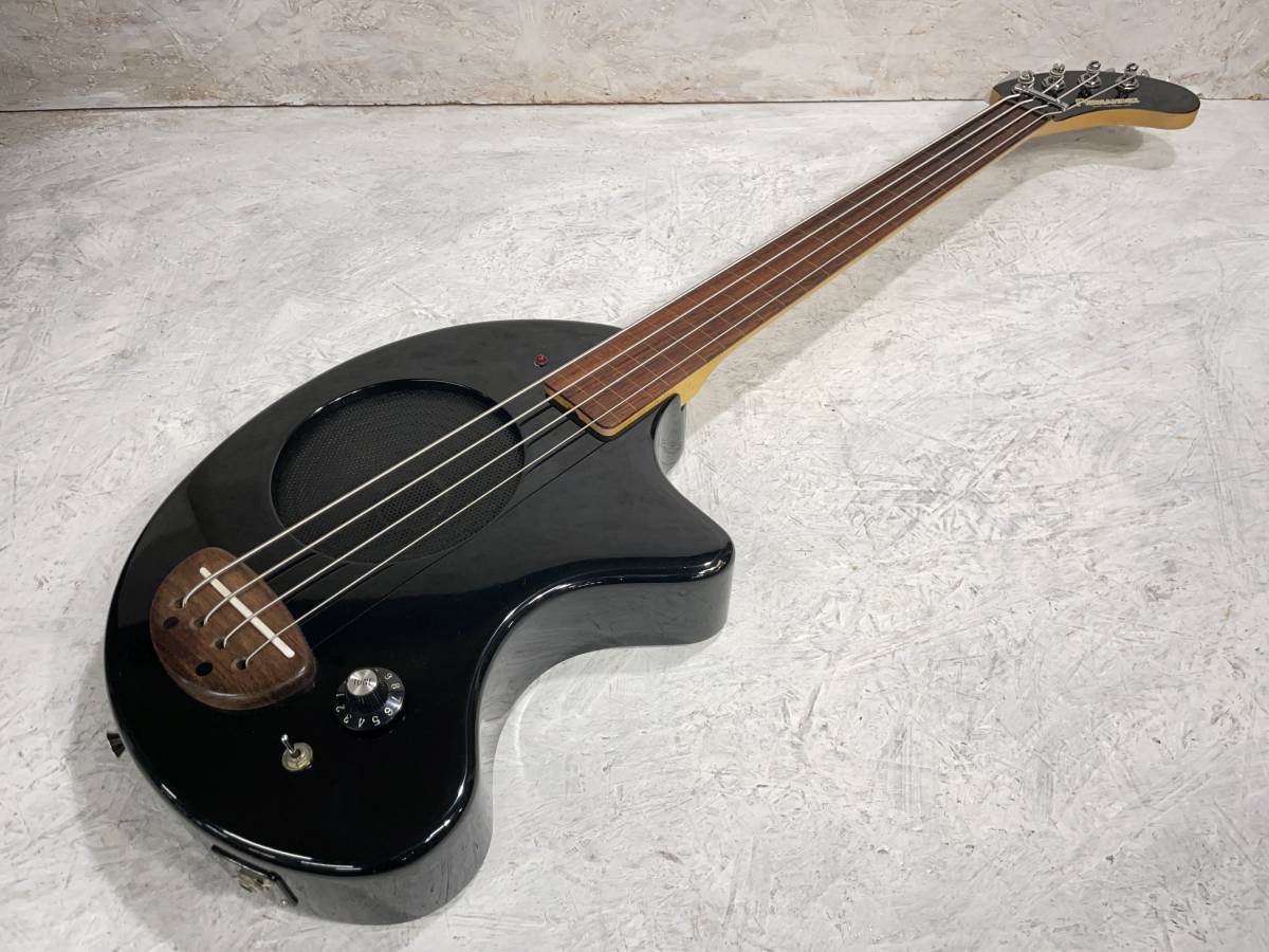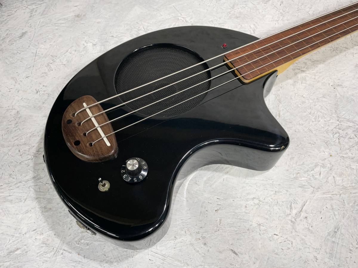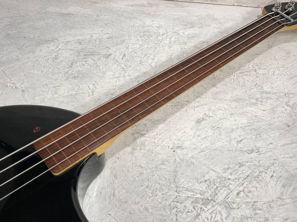 アンプ内蔵のフレットレスベースです。ショートスケースで手の小さな方でも弾きやすいです。スピーカーリングのない初期のもので18V仕様です。