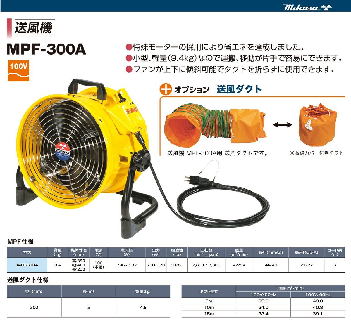 ミカサ/mikasa 送風機 MPF-300A用 送風ダクト(収納カバー付き 5m) ※ブレードは、別売です。※こちらの商品は、「代金引換」支払を ご利用いただけません。