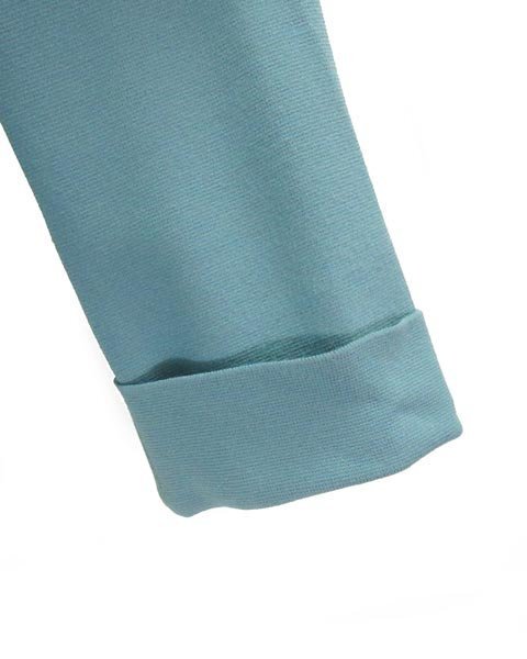 | くすみブルーのニットジャケット。大き目ボタンは天然の貝が使われていて、光の加減でキラキラしています。ジャケットの裾に向かって広がりのあるフレアーデザイン。脚長効果があります。 |