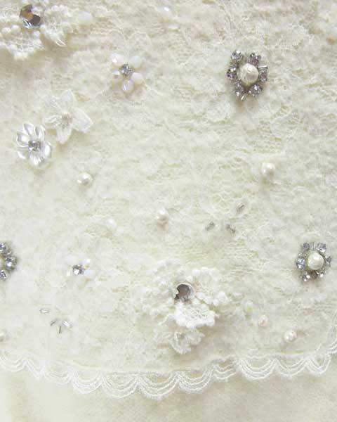 アンゴラ混のふんわりフェミニンなワンピース。胸元のレースやラインストーンなど凝ったおつくり。甘目デザインがお好きな方におすすめです。ダークカラーになりがちな秋冬スタイルの差し色としていかがでしょうか。 |
