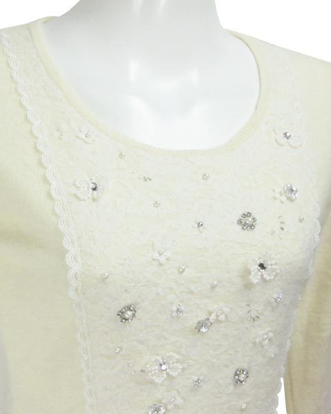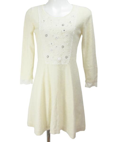 コメント | アンゴラ混のふんわりフェミニンなワンピース。 胸元のレースやラインストーンなど凝ったおつくり。 甘目デザインがお好きな方におすすめです。 ダークカラーになりがちな秋冬スタイルの差し色として いかがでしょうか。 |