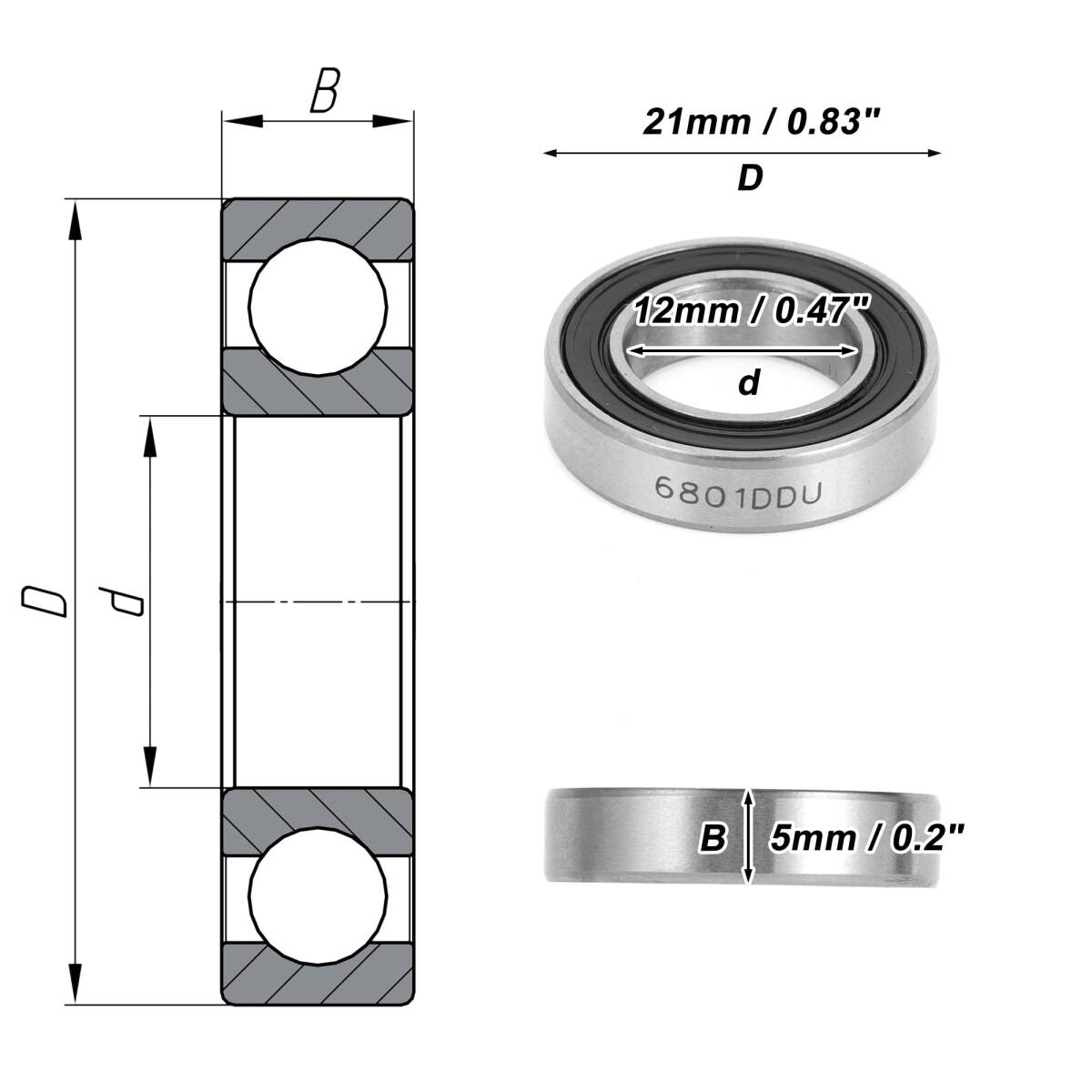 仕様:外径: 21mm/ 0.83"、内径: 12mm/ 0.47"、幅: 5mm/ 0.2"、タイプ: 6801DD、精度レベル: P6、基本荷重評価 (kN): Cr:1.92 C0r:1.04、限界速度(min-1): グリスス:20000